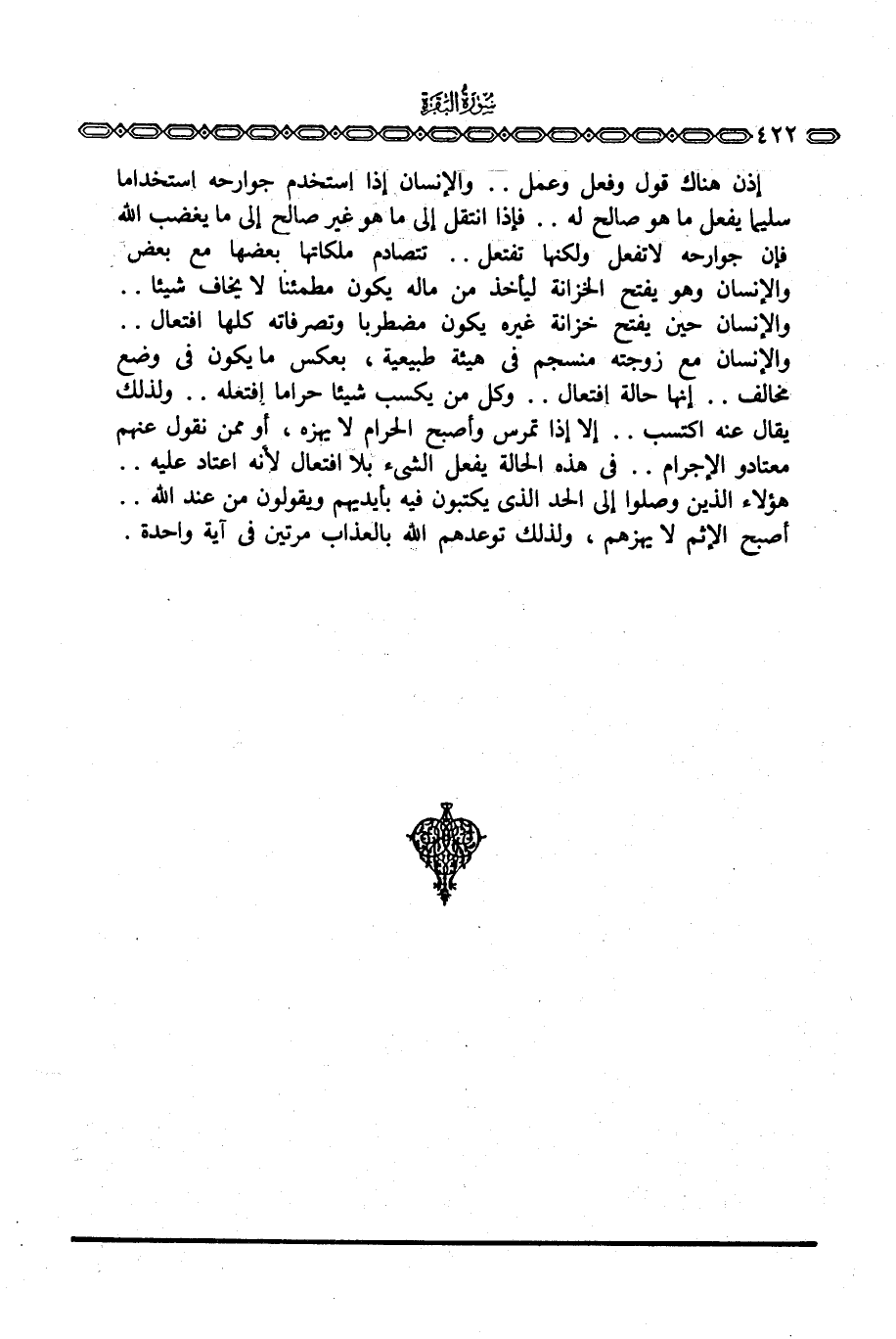 . تتصادم ملكاتها بعضها مع بعض والإنسان وهو يفتح الخزانة ليأخذ من ماله يكون مطمئنا لا يخاف شيئا. . والإنسان حين يفتح خزانة غيره يكون مضطربا وتصرفاته كلها افتعال. . والإنسان مع زوجته منسجم في هيئة طبيعية، بعكس ما يكون في وضع مخالف. . إنها حالة افتعال. . وكل من يكسب شيئا حراما افتعله. . ولذلك يقال عنه اكتسب. . إلا إذا تمرس وأصبح الحرام لا يهزه، أو ممن نقول عنهم معتادو الإجرام. . في هذه الحالة يفعل الشيء بلا افتعال لأنه اعتاد عليه. . هؤلاء الذين وصلوا إلى الحد الذي يكتبون فيه بأيديهم ويقولون من عند الله. . أصبح الإثم لا يهزهم، ولذلك توعدهم الله بالعذاب مرتين في آية واحدة.