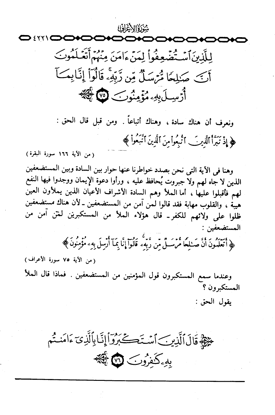 وهنا في الآية التي نحن بصدد خواطرنا عنها حوار بين السادة وبين المستضعفين الذين لا جاه لهم لا جبروت يُحافظ عليه، ورأوا دعوة الإِيمان ووجدوا فيها النفع لهم فأقبلوا عليها، أما الملأ وهم السادة الأشراف الأعيان الذين يملأون العين هيبة، والقلوب مهابة فقد قالوا لمن آمن من المستضعفين - لأن هناك مستضعفين ظلوا على ولائهم للكفر - قال هؤلاء الملأ من المستكبرين لمن آمن من المستضعفين: { ... أَتَعْلَمُونَ أَنَّ صَالِحاً مُّرْسَلٌ مِّن رَّبِّهِ قالوا إِنَّا بِمَآ أُرْسِلَ بِهِ مُؤْمِنُونَ} [الأعراف: 75]