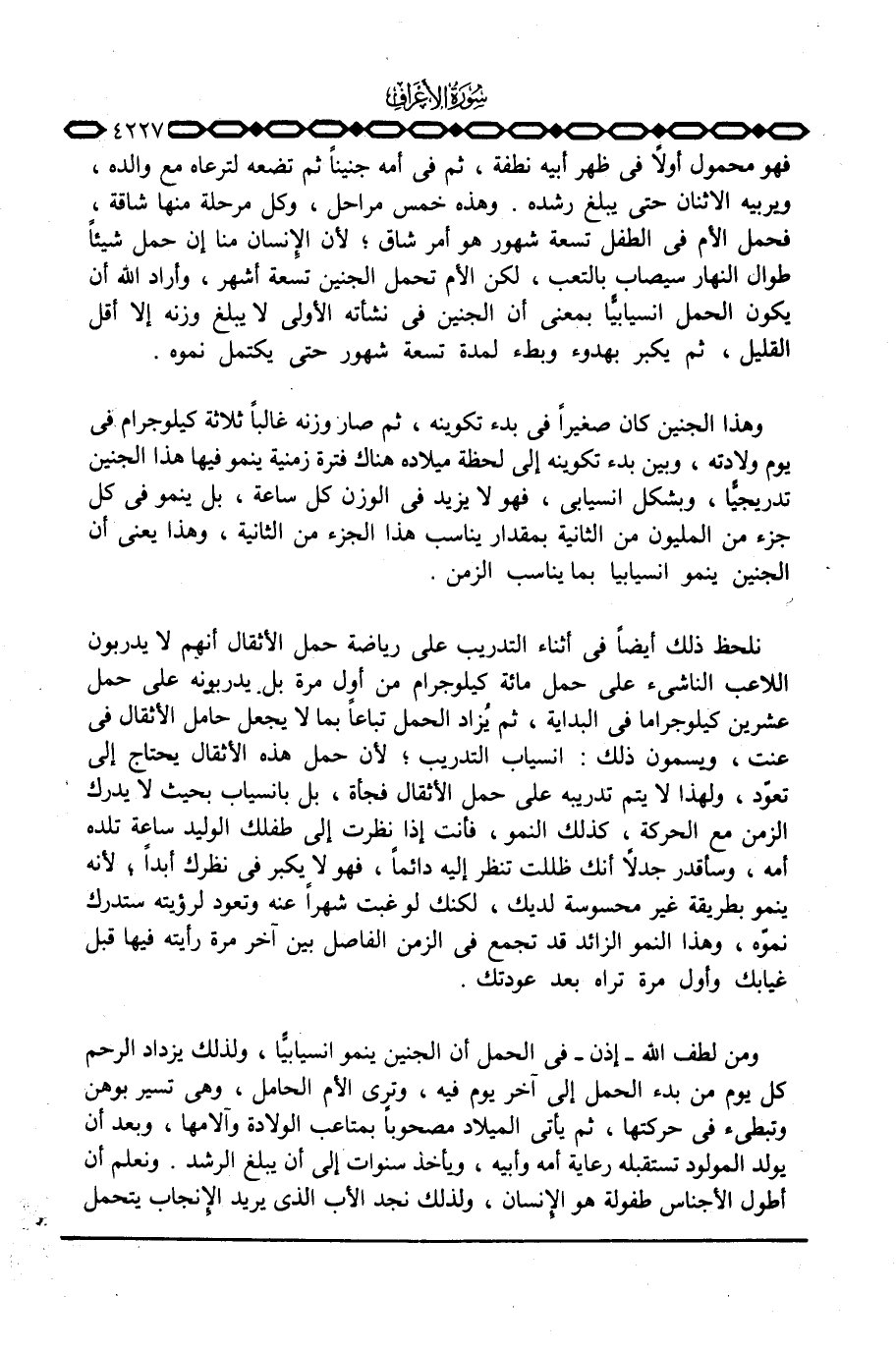 ومن لطف الله - إذن - في الحمل أن الجنين ينمو انسيابياً، ولذلك يزداد الرحم كل يوم من بدء الحمل إلى آخر يوم فيه، وترى الأم الحامل، وهي تسير بوهن وتبطئ في حركتها، ثم يأتي الميلاد مصحوباً بمتاعب الولادة وآلامها، وبعد أن يولد المولود تستقبله رعاية أمه وأبيه، ويأخذ سنوات إلى أن يبلغ الرشد. ونعلم أن أطول الأجناس طفولة هو الإنسان، ولذلك نجد الأب الذي يريد الإنجاب يتحمل