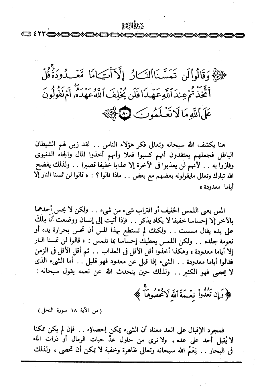 المس يعني اللمس الخفيف أو اقتراب شيء من شيء. . ولكن لا يحس أحدهما بالآخر إلا إحساسا خفيفا لا يكاد يذكر. . فإذا أتيت إلى إنسان ووضعت أَنَا مِلَكَ على يده يقال مسست. . ولكنك لم تستطع بهذا المس أن تحس بحرارة يده أو نعومة جلده. . ولكن اللمس يعطيك إحساسا بما تلمس: {وَقَالُواْ لَن تَمَسَّنَا النار إِلاَّ أَيَّاماً مَّعْدُودَةً} وهكذا أخذوا أقل الأقل في العذاب. . ثم أقل الأقل في الزمن فقالوا أياما معدودة. . الشيء إذا قيل عن معدود فهو قليل. . أما الشيء الذي لا يحصى فهو الكثير. . ولذلك حين يتحدث الله عن نعمه يقول سبحانه: {وَإِن تَعُدُّواْ نِعْمَةَ الله لاَ تُحْصُوهَآ} [النحل: 18]