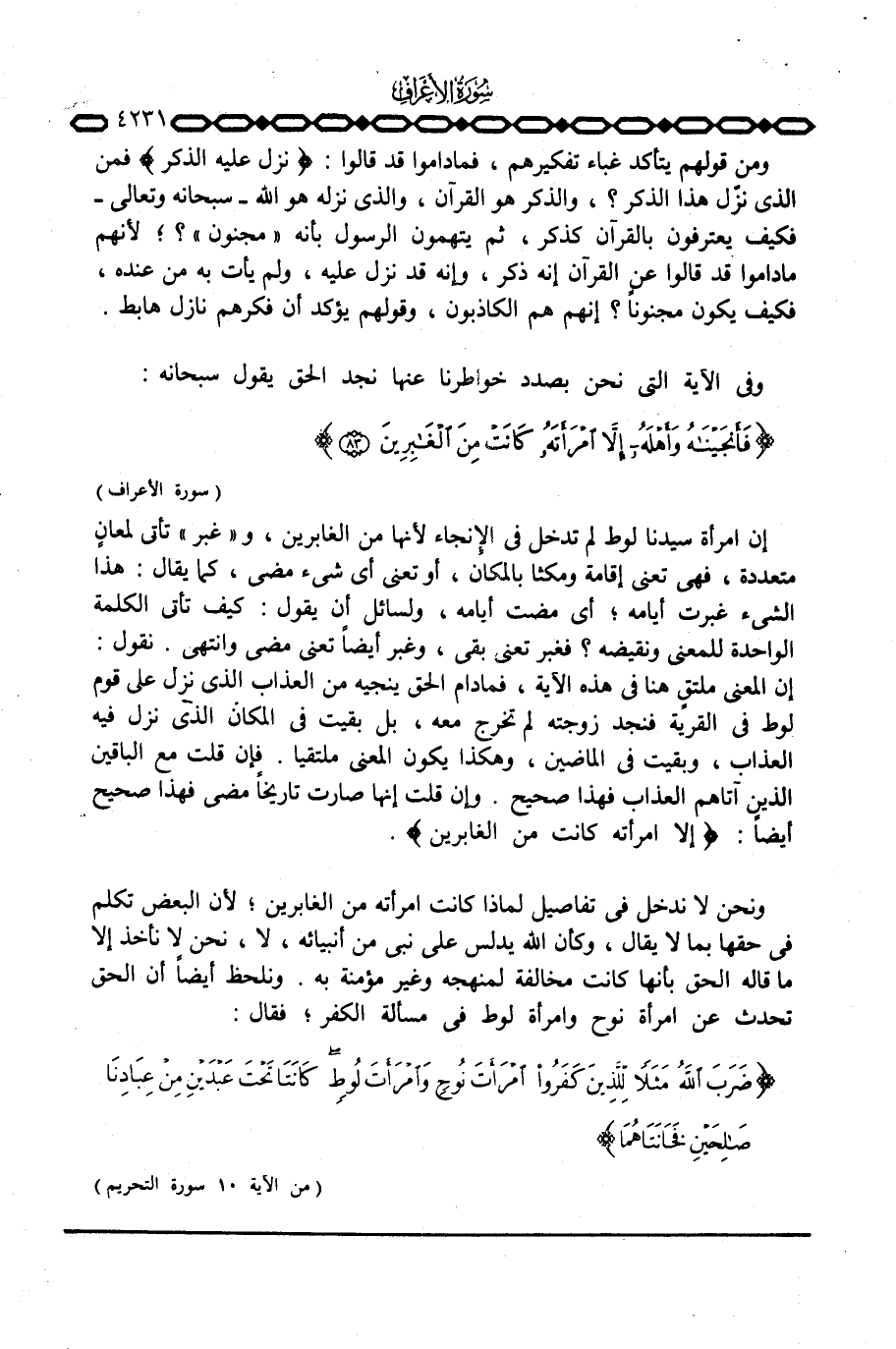وفي الآية التي نحن بصدد خواطرنا عنها نجد الحق يقول سبحانه: {فَأَنجَيْنَاهُ وَأَهْلَهُ إِلاَّ امرأته كَانَتْ مِنَ الغابرين} [الأعراف: 83]