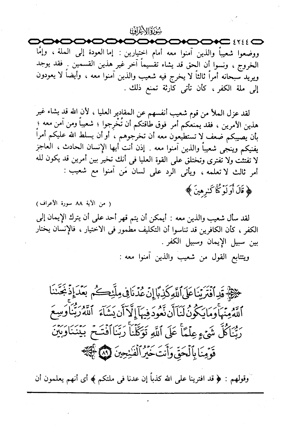 لقد عزل الملأ من قوم شعيب أنفسهم عن المقادير العليا، لأن الله قد يشاء غير هذين الأمرين، فقد يمنعكم أمر فوق طاقتكم أن تُخْرِجوا؛ شعيباً ومن آمن معه؛ بأن يصيبكم ضعف لا تستطيعون معه أن تخرجوهم، أو أن يسلط الله عليكم أمراً يفنيكم وينجي شعيباً والذين آمنوا معه. إذن أنت أيها الإِنسان الحادث، العاجز لا تفتئت ولا تفتري وتختلق على القوة العليا في أنك تخير بين أمرين قد يكون لله أمر ثالث لا تعلمه، ويأتي الرد على لسان مَن آمنوا مع شعيب: {قَالَ أَوَلَوْ كُنَّا كَارِهِينَ} [الأعراف: 88]