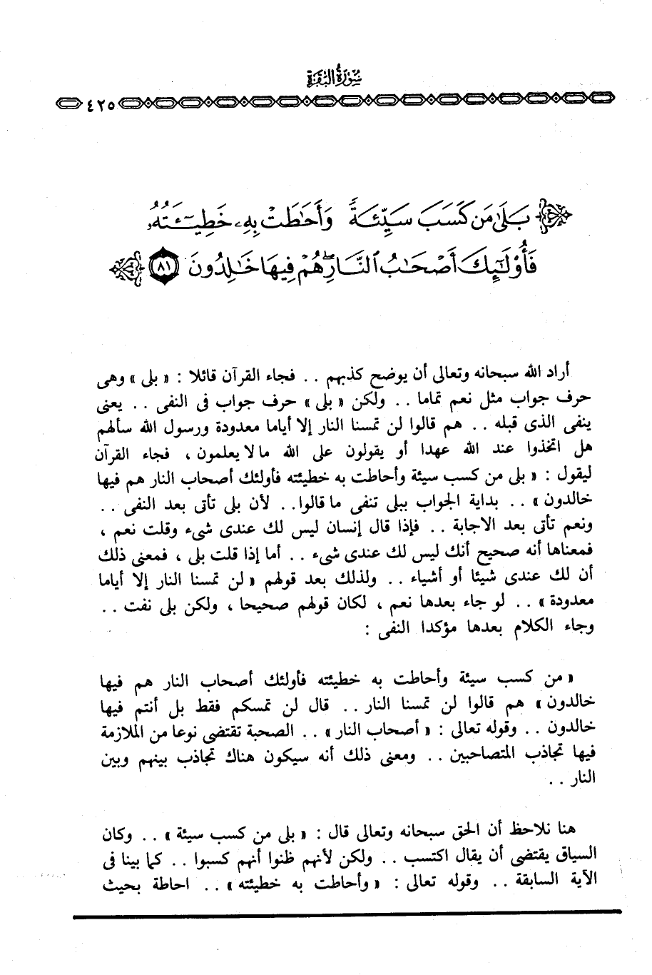 أراد الله سبحانه وتعالى أن يوضح كذبهم. . فجاء القرآن قائلا: «بلى» وهي حرف جواب مثل نعم تماما. . ولكن «بلى» حرف جواب في النفي. . يعني ينفي الذي قبله. . هم قالوا لن تمسنا النار إلا أياما معدودة ورسول الله سألهم هل اتخذوا عند الله عهدا أو يقولون على الله ما لا يعلمون، فجاء القرآن ليقول: {بلى مَن كَسَبَ سَيِّئَةً وَأَحَاطَتْ بِهِ خطيائته فأولئك أَصْحَابُ النار هُمْ فِيهَا خَالِدُونَ} . . بداية الجواب ببلى تنفي ما قالوا. . لأن بلى تأتي بعد النفي. . ونعم تأتي بعد الإجابة. . فإذا قال إنسان ليس لك عندي شيء وقلت نعم، فمعناها أنه صحيح أنك ليس لك عندي شيء. . أما إذا قلت بلى، فمعنى ذلك أن لك عندي شيئا أو أشياء. . ولذلك بعد قولهم {لَن تَمَسَّنَا النار إِلاَّ أَيَّاماً مَّعْدُودَةً} . . لو جاء بعدها نعم، لكان قولهم صحيحا، ولكن بلى نفت. . وجاء الكلام بعدها مؤكدا النفي:
