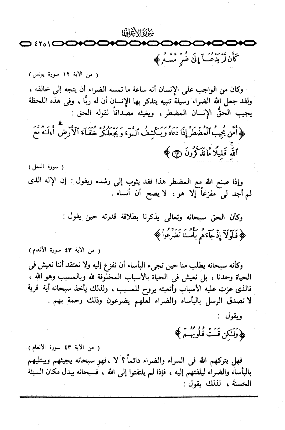 وكان من الواجب على الإنسان أنه ساعة ما تمسه الضراء أن يتجه إلى خالقه، ولقد جعل الله الضراء وسيلة تنبيه يتذكر بها الإنسان أن له ربا، وفي هذه اللحظة يجيب الحق الإنسان المضطر، ويغيثه مصداقاً لقوله الحق: {أَمَّن يُجِيبُ المضطر إِذَا دَعَاهُ وَيَكْشِفُ السواء وَيَجْعَلُكُمْ خُلَفَآءَ الأرض أإله مَّعَ الله قَلِيلاً مَّا تَذَكَّرُونَ} [النمل: 62]