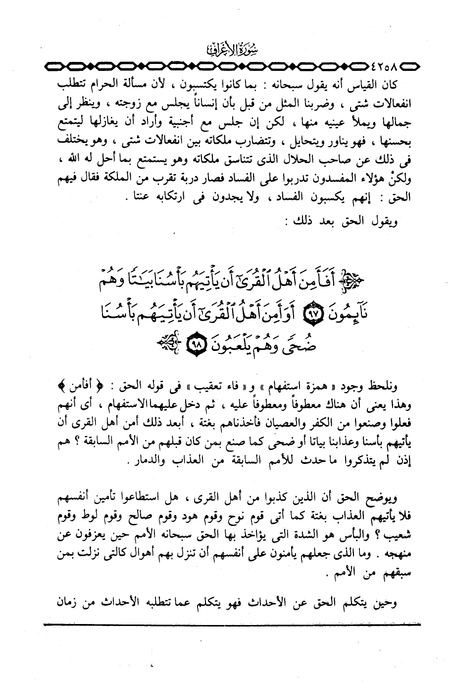 ونلحظ وجود ذ «همزة استفهام» و «فاء تعقيب» في قوله: {أَفَأَمِنَ} وهذا يعني أن هناك معطوفاً ومعطوفاً عليه، ثم دخل عليهما الاستفهام، أي أنهم فعلوا وصنعوا من الكفر والعصيان فأخذناهم بغتة، أبعد ذلك أمن أهل القرى أن يأتيهم بأسنا وعذابنا بياتاً أو ضحى كما صنع بمن كان قبلهم من الأمم السابقة؟ هم إذن لم يتذكروا ما حدث للأمم السابقة من العذاب والدمار.