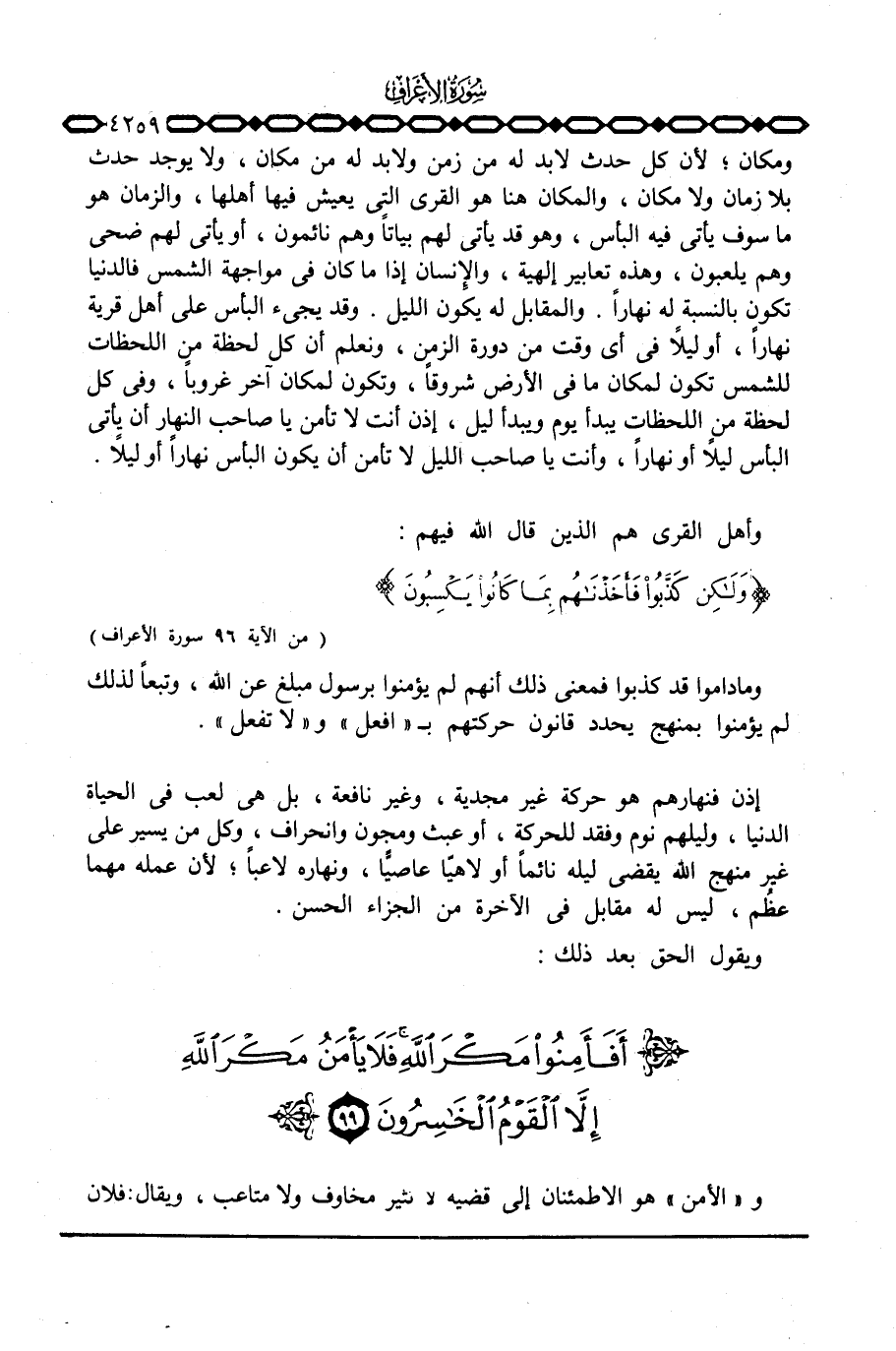 ومكان؛ لأن كل حدث لابد له من زمن ولابد له من مكان، ولا يوجد حدث بلا زمان ولا مكان، والمكان هنا هو القرى التي يعيش فيها أهلها، والزمان هو ما سوف يأتي فيه البأس، وهو قد يأتي لهم وهم نائمون، أو يأتي لهم ضحى وهم يلعبون، وهذه تعابير إلهية، والإِنسان إذا ما كان في مواجهة الشمس فالدنيا تكون بالنسبة له نهاراً. والمقابل له يكون الليل. وقد يجيء البأس على أهل قرية نهاراً، أو ليلاً في أي وقت من دورة الزمن، ونعلم أن كل لحظة من اللحظات للشمس تكون لمكان ما في الأرض شروقاً، وتكون لمكان آخر غروباً، وفي كل لحظة من اللحظات يبدأ يوم ويبدأ ليل، إذن أنت لا تأمن يا صاحب النهار أن يأتي البأس ليلاً أو نهاراً، وأنت يا صاحب الليل لا تأمن أن يكون البأس نهاراً أو ليلاً.