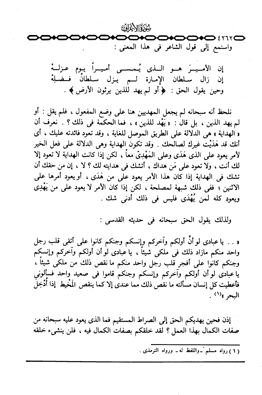 « ... يا عبادي لو أنَّ أولكم وآخركم وإِنسكم وجنكم كانوا على أتقى قلب رجل واحد منكم ما زاد ذلك في ملكي شيئاً، يا عبادي لو أن أولكم وآخركم وإِنسكم وجنكم كانوا على أفجر قلب رجل واحد منكم ما نقص ذلك من ملكي شيئاً، يا عبادي لو أن أولكم وآخركم وإنسكم وجنكم قاموا في صعيد واحد فسألوني ِ فأعطيت كل إنسان مسألته ما نقص ذلك مما عندي إلا كما ينقص المَخْيط إذا أُدْخِلَ البحر» .