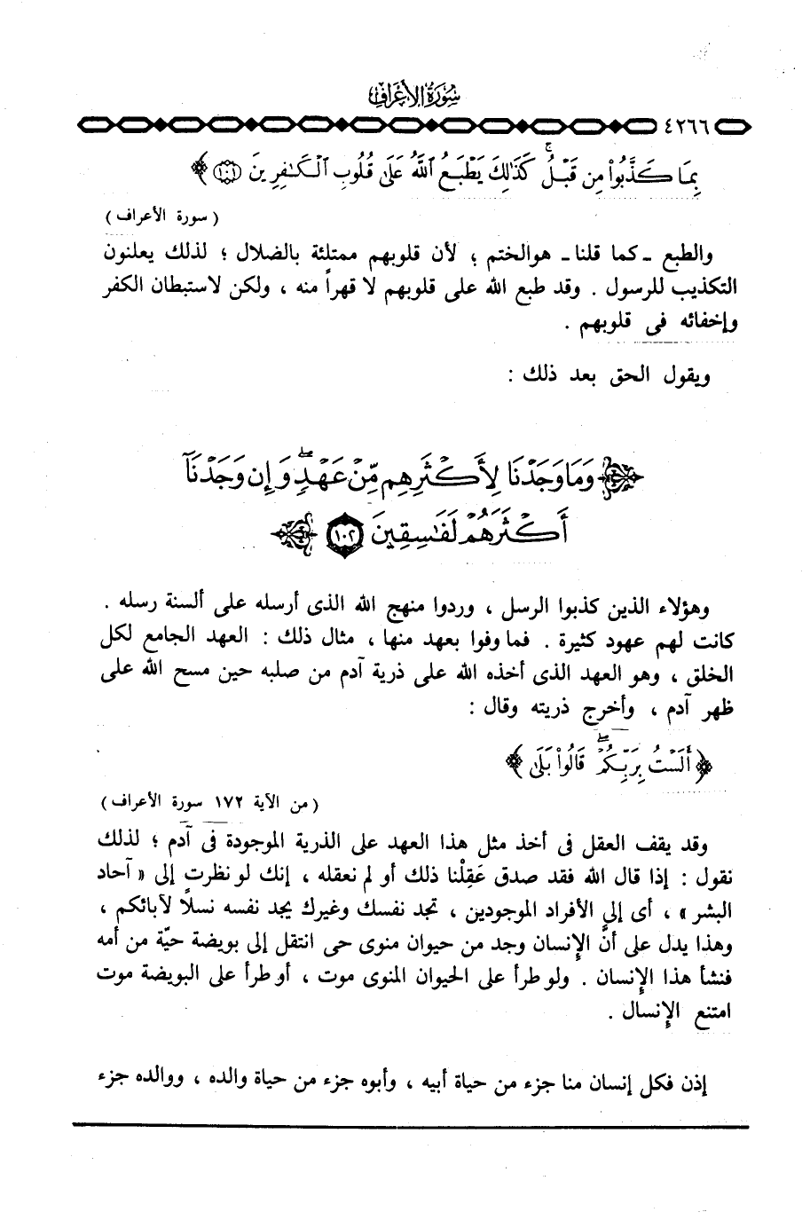 وقد يقف العقل في أخذ مثل هذا العهد على الذرية الموجودة في آدم؛ لذلك نقول: إذا قال الله فقد صدق عَقِلْنا ذلك أو لم نعقله، إنك لو نظرت إلى «آحاد البشر» ، أي إلى الأفراد الموجودين، تجد نفسك وغيرك يجد نفسه نسلاً لآبائكم، وهذا يدل على أنَّ الإِنسان وجد من حيوان منوي حي انتقل إلى بويضة حيّة من أمه فنشأ هذا الإنسان. ولو طرأ على الحيوان المنوي موت، أو طرأ على البويضة موت امتنع الإِنسال.