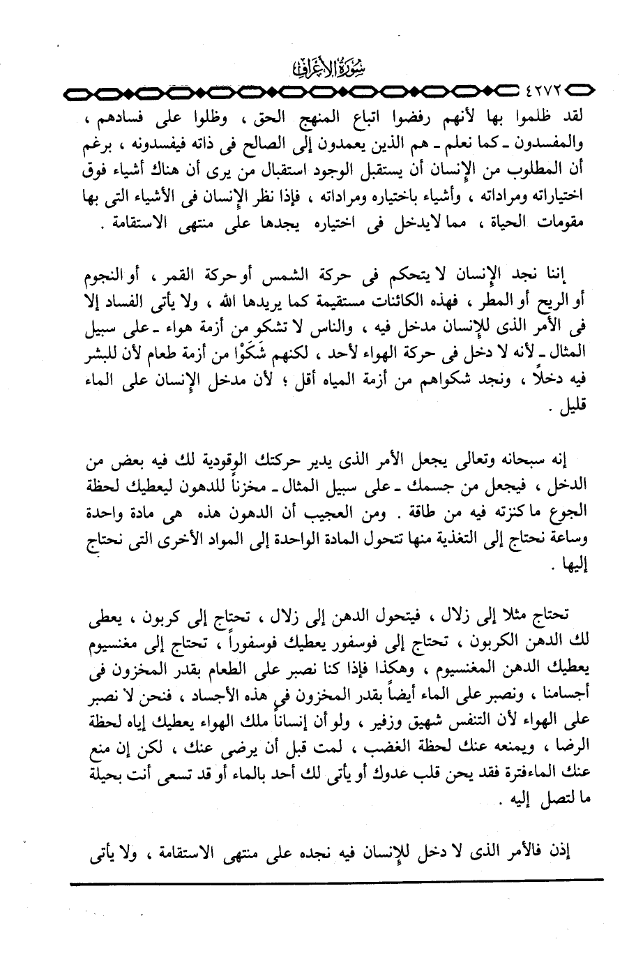 إنه سبحانه وتعالى يجعل الأمر الذي يدير حركتك الوقودية لك فيه بعض من الدخل، فيجعل من جسمك - على سبيل المثال - مخزناً للدهون ليعطيك لحظة الجوع ما كنزته فيه من طاقة. ومن العجيب أن الدهون هذه هي مادة واحدة وساعة نحتاج إلى التغذية منها تتحول المادة الواحدة إلى المواد الأخرى التي نحتاج إليها.