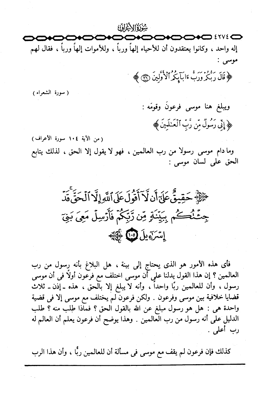 فأي هذه الأمور هو الذي يحتاج إلى بينة، هل البلاغ بأنه رسول من رب العالمين؟ إن هذا القول يدلنا على أن موسى اختلف مع فرعون أولاً في أن موسى رسول، وأن للعالمين رباً واحداً، وأنه لا يبلغ إلا بالحق، هذه - إذن - ثلاث قضايا خلافية بين موسى وفرعون، ولكن فرعون لم يختلف مع موسى إلا في قضية واحدة هي: هل هو رسول بلغ عن الله بالقول الحق؟ فماذا طلب منه؟ طلب الدليل على أنه رسول من رب العالمين. وهذا يوضح أن فرعون يعلم أن العالم له رب أعلى.