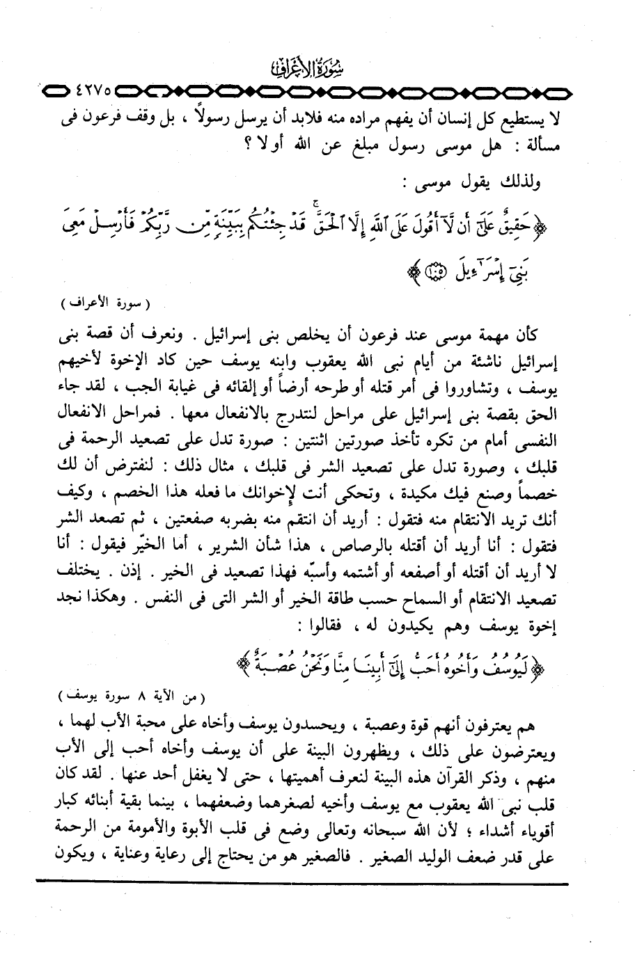 كأن مهمة موسى عند فرعون أن يخلص بني إسرائيل. ونعرف أن قصة بني إسرائيل ناشئة من أيام نبي الله يعقوب وابنه يوسف حين كاد الإخوة لأخيهم يوسف، وتشاوروا في أمر قتله أو طرحه أرضاً أو إلقائه في غيابة الجب، لقد جاء الحق بقصة بني إسرائيل على مراحل لنتدرج بالانفعال معها. فمراحل الانفعال النفسي أمام من تكره تأخذ صورتين اثنتين: صورة تدل على تصعيد الرحمة في قلبك، وصورة تدل على تصعيد الشر في قلبك، مثال ذلك: لنفترض أن لك خصماً وصنع فيك مكيدة، وتحكي أنت لإِخوانك ما فعله هذا الخصم، وكيف أنك تريد الانتقام منه فتقول: أريد أن انتقم منه بضربه صفعتين، ثم تصعد الشر فتقول: أنا أريد أن أقتله بالرصاص، هذا شأن الشرير، أما الخيّر فيقول: أنا لا أريد أن أقتله أو أصفعه أو أشتمه وأسبّه فهذا تصعيد في الخير. إذن. يختلف تصعيد الانتقام أو السماح حسب طاقة الخير أو الشر التي في النفس. وهكذا نجد إخوة يوسف وهو يكيدون له، فقالوا: {لَيُوسُفُ وَأَخُوهُ أَحَبُّ إلى أَبِينَا مِنَّا وَنَحْنُ عُصْبَةٌ ... } [يوسف: 8]