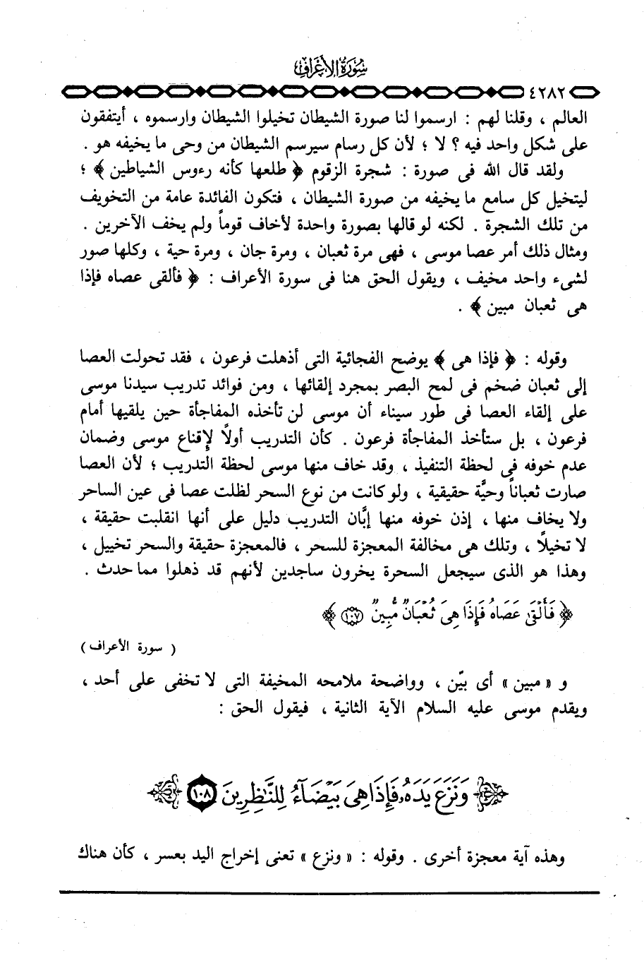 ولقد قال الله في صورة: شجرة الزقوم {طَلْعُهَا كَأَنَّهُ رُءُوسُ الشياطين} ؛ ليتخيل كل سامع ما يخيفه من صورة الشيطان، فتكون الفائدة عامة من التخويف من تلك الشجرة. لكنه لو قالها بصورة واحدة لأخاف قوماً ولم يخف الآخرين. ومثال ذلك أمر عصا موسى، فهي مرة ثعبان، ومرة جان، ومرة حية، وكلها صور لشيء واحد مخيف، ويقول الحق هنا في سورة الأعراف: {فألقى عَصَاهُ فَإِذَا هِيَ ثُعْبَانٌ مُّبِينٌ} .
