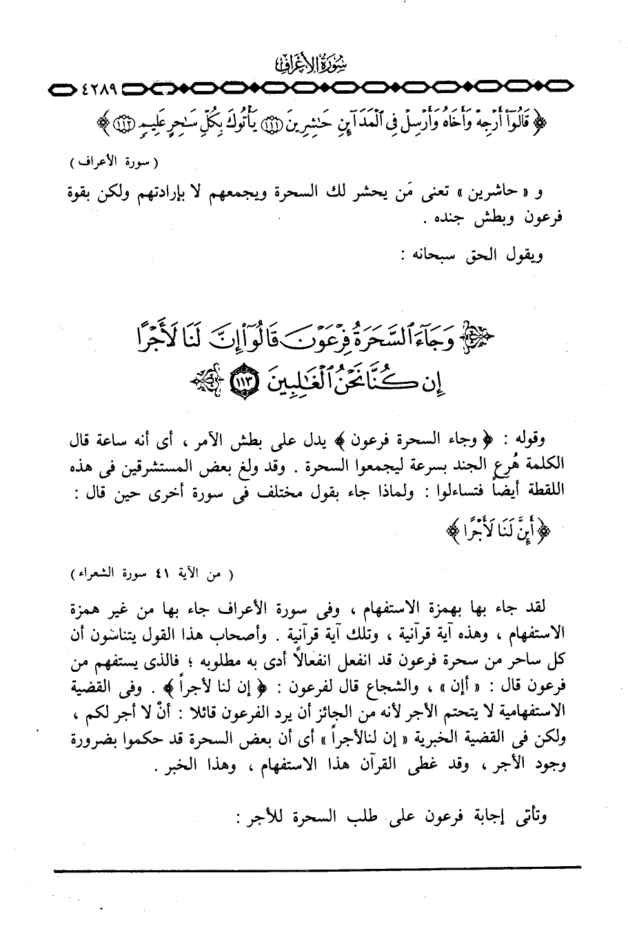 لقد جاء بها بهمزة الاستفهام، وفي سورة الأعراف جاء من غير همزة الاستفهام، وهذه آية قرآنية، وتلك آية قرآنية. وأصحاب هذا القول يتناسون أن كل ساحر من سحرة فرعون قد انفعل انفعالاً أدى به مطلوبه؛ فالذي يستفهم من فرعون قال: «أإن» ، والشجاع قال لفرعون: {أَإِنَّ لَنَا لأَجْراً} . وفي القضية الاستفهامية لا يتحتم الأجر لأنه من الجائز أن يرد الفرعون قائلا: أنْ لا أجر لكم، ولكن في القضية الخبرية «إن لنا لأجراً» اي أن بعض السحرة قد حكموا بضرورة وجود الأجر، وقد غطى القرآن هذا الاستفهام، وهذا الخبر.