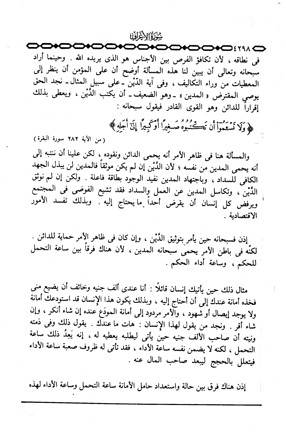 في نطاقه، لأن تكافؤ الفرص بين الأجناس هو الذي يريده الله. وحينما أراد سبحانه وتعالى أن يبين لنا هذه المسألة أوضح أن على المؤمن أن ينظر إلى المعطيات من وراء التكاليف، وفي آية الدّيْن - على سبيل المثال - نجد الحق يوصي المقترض «المدين» - وهو الضعيف - أن يكتب الدَّيْن، ويعطي بذلك إقراراً للدائن وهو القوي القادر فيقول سبحانه: