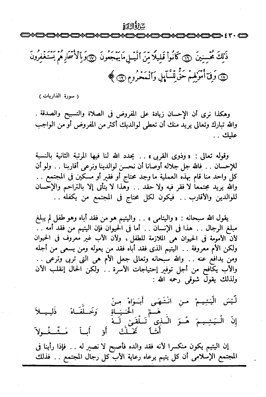 ويقول الله سبحانه: «واليتامى» . . واليتيم هو من فقد أباه وهو طفل لم يبلغ مبلغ الرجال. . هذا في الإنسان. . أما في الحيوان فإن اليتيم من فقد أمه. . لأن الأمومة في الحيوان هي الملازمة للطفل، ولأن الأب غير معروف في الحيوان ولكن الأم معروفة. . اليتيم الذي فقد أباه فقد من يعوله ومن يسعى من أجله ومن يدافع عنه. . والله سبحانه وتعالى جعل الأم هي التي تربي وترعى. . والأب يكافح من أجل توفير احتياجات الأسرة. . ولكن الحال إنقلب الآن ولذلك يقول شوقي رَحِمَهُ اللَّهُ: