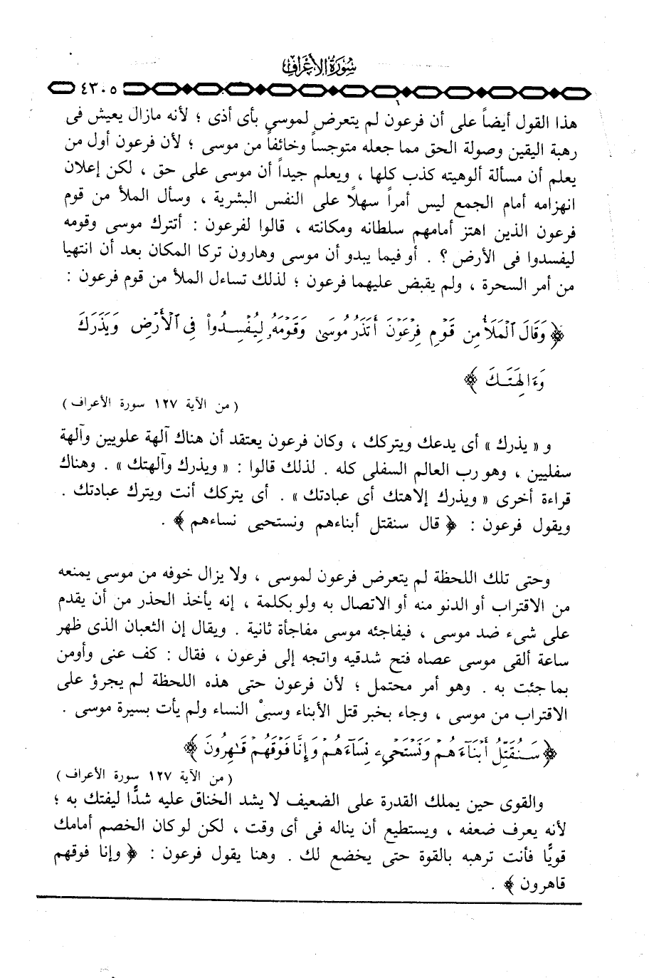 و «يذرك» أي يدعك ويتركك، وكان فرعون يعتقد أن هناك آلهة علويين وآلهة سفليين، وهو رب العالم السفلي كله. لذلك قالوا: {وَيَذَرَكَ وَآلِهَتَكَ} . وهناك قراءة أخرى «ويذرك إلاهتك أي عبادتك» . أي يتركك أنت ويترك عبادتك. ويقول فرعون: {قَالَ سَنُقَتِّلُ أَبْنَآءَهُمْ وَنَسْتَحْيِي نِسَآءَهُمْ} .
