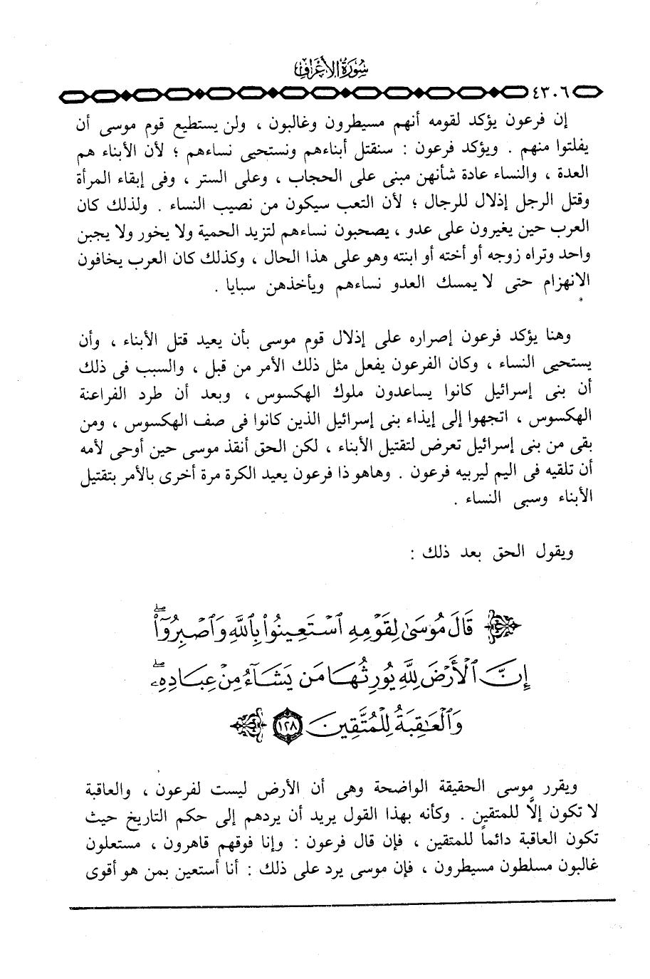 ويقرر موسى الحقيقة الواضحة وهي أن الأرض ليست لفرعون، والعاقبة لا تكون إلاَّ للمتقين. وكأنه بهذا القول يريد أن يردهم إلى حكم التاريخ حيث تكون العاقبة دائماً للمتقين، فإن قال لفرعون: وإنا فوقهم قاهرون، مستعلون غالبون مسلطون مسيطرون، فإن موسى يرد على ذلك: أنا أستعين بمن هو أقوى