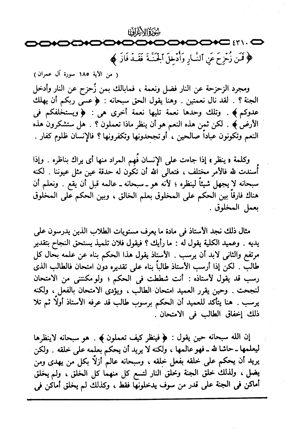 إن الله سبحانه حين يقول: {فَيَنظُرَ كَيْفَ تَعْمَلُونَ} . هو سبحانه لا ينظرها ليعلمها - حاشا الله - فهو عالمها، ولكنه لا يريد أن يحكم بعلمه على خلقه. ولكن يريد أن يحكم على خلقه بفعل خلقه، وسبحانه عالم أزلاً بكل من يهدي ومن يضل. ولذلك خلق الجنة وخلق النار لتسع كل منهما كل الخلق، ولم يخلق أماكن في الجنة على قدر من سوف يدخلونها فقط، وكذلك لم يخلق أماكن في