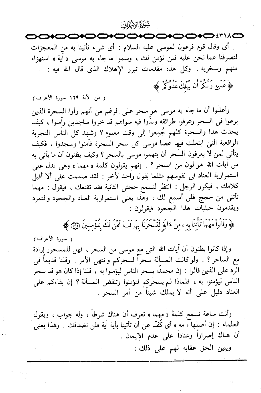 وأعلنوا أن ما جاء به موسى هو سحر على الرغم من أنهم رأوا السحرة الذين برعوا في السحر وعرفوا طرائقه وبذّوا فيه سواهم قد خروا ساجدين وآمنوا، كيف يحدث هذا والسحرة كلهم جُمِعوا إلى وقت معلوم؟ وشهد كل الناس التجربة الواقعية التي ابتلعت فيها عصا موسى كل سحر السحرة فآمنوا وسجدوا، فكيف يتأتى لمن لا يعرفون السحر أن يتهموا موسى بالسحر؟ وكيف يظنون أن ما يأتي به من آيات الله هو لون من السحر؟ . إنهم يقولون كلمة «مهما» وهي تدل على استمرارية العناد في نفوسهم مثلما يقول واحد لآخر: لقد صممت على ألا أقبل كلامك، فيكرر الرجل: انتظر لتسمع حجتي الثانية فقد تقنعك، فيقول: مهما تأتني من حجج فلن أسمع لك، وهذا يعني استمرارية العناد والجحود والتمرد ويقدمون حيثيات هذا الجحود فيقولون: {وَقَالُواْ مَهْمَا تَأْتِنَا بِهِ مِن آيَةٍ لِّتَسْحَرَنَا بِهَا فَمَا نَحْنُ لَكَ بِمُؤْمِنِينَ} [الأعراف: 132]