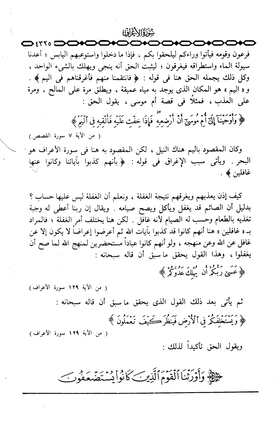 وكان المقصود باليم هناك النيل، لكن المقصود به هنا في سورة الأعراف هو البحر. ويأتي سبب الإِغراق في قوله: {بِأَنَّهُمْ كَذَّبُواْ بِآيَاتِنَا وَكَانُواْ عَنْهَا غَافِلِينَ} .