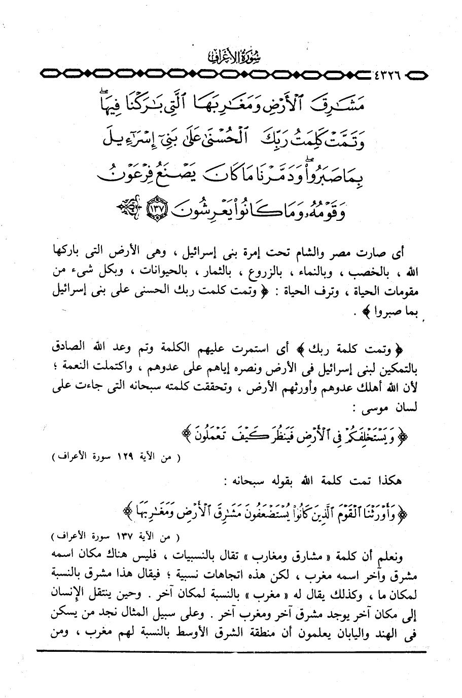 أي صارت مصر والشام تحت إمرة بني إسرائيل، وهي الأرض التي باركها الله، بالخصب، وبالنماء، بالزروع، بالثمار، بالحيوانات، وبكل شيء من مقومات الحياة، وترف الحياة: {وَتَمَّتْ كَلِمَةُ رَبِّكَ الحسنى على بني إِسْرَآئِيلَ بِمَا صَبَرُواْ} .