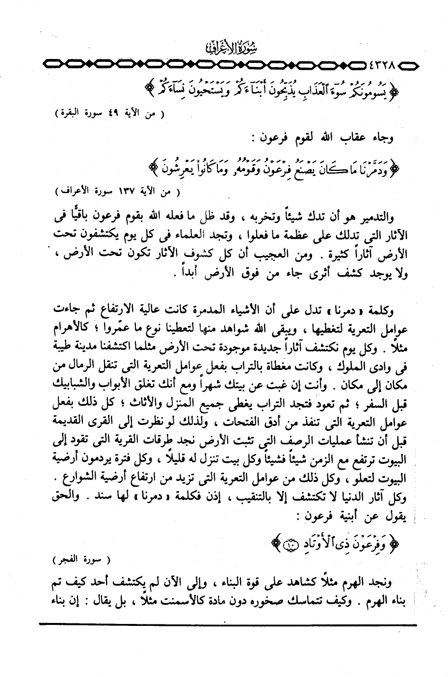 وكلمة «دمرنا» تدل على أن الأشياء المدمرة كانت عالية الارتفاع ثم جاءت عوامل التعرية لتغطيها، ويبقى الله شواهد منها لتعطينا نوع ما عمّروا؛ كالأهرام مثلاً. وكل يوم نكتشف آثاراً جديدة موجودة تحت الأرض مثلما اكتشفنا مدينة طيبة في وادي الملوك، وكانت مغطاة بالتراب بفعل عوامل التعرية التي تنقل الرمال من مكان إلى مكان. وأنت إن غبت عن بيتك شهراً ومع أنك تغلق الأبواب والشبابيك قبل السفر؛ ثم تعود فتجد التراب يغطي جميع المنزل والأثاث؛ كل ذلك بفعل عوامل التعرية التي تنفذ من أدق الفتحات، ولذلك لو نظرت إلى القرى القديمة قبل أن تنشأ عمليات الرصف التي تثبت الأرض نجد طرقات القرية التي تقود إلى البيوت ترتفع مع الزمن شيئاً فشيئاً وكل بيت تنزل به قليلاً، وكل فترة يردمون أرضية البيوت لتعلو، وكل ذلك من عوامل التعرية التي تزيد من ارتفاع أرضية الشوارع. وكل آثار الدنيا لا تكتشف إلا بالتنقيب، إذن فكلمة «دمرنا» لها سند. والحق يقول عن أبنية فرعون: {وَفِرْعَوْنَ ذِى الأوتاد} [الفجر: 10]