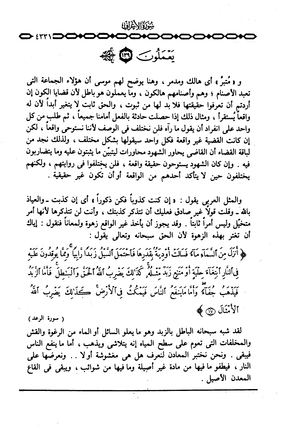 لقد شبه سبحانه الباطل بالزبد وهو ما يعلو السائل أو الماء من الرغوة والقش والمخلفات التي تعوم على سطح المياه إنه يتلاشى ويذهب، أما ما ينفع الناس فيبقى. ونحن نختبر المعادن لنعرف هل هي مغشوشة أو لا. . ونعرضها على النار، فيطفوا ما فيها من مادة غير أصيلة وما فيها من شوائب، ويبقى في القاع المعدن الأصيل.