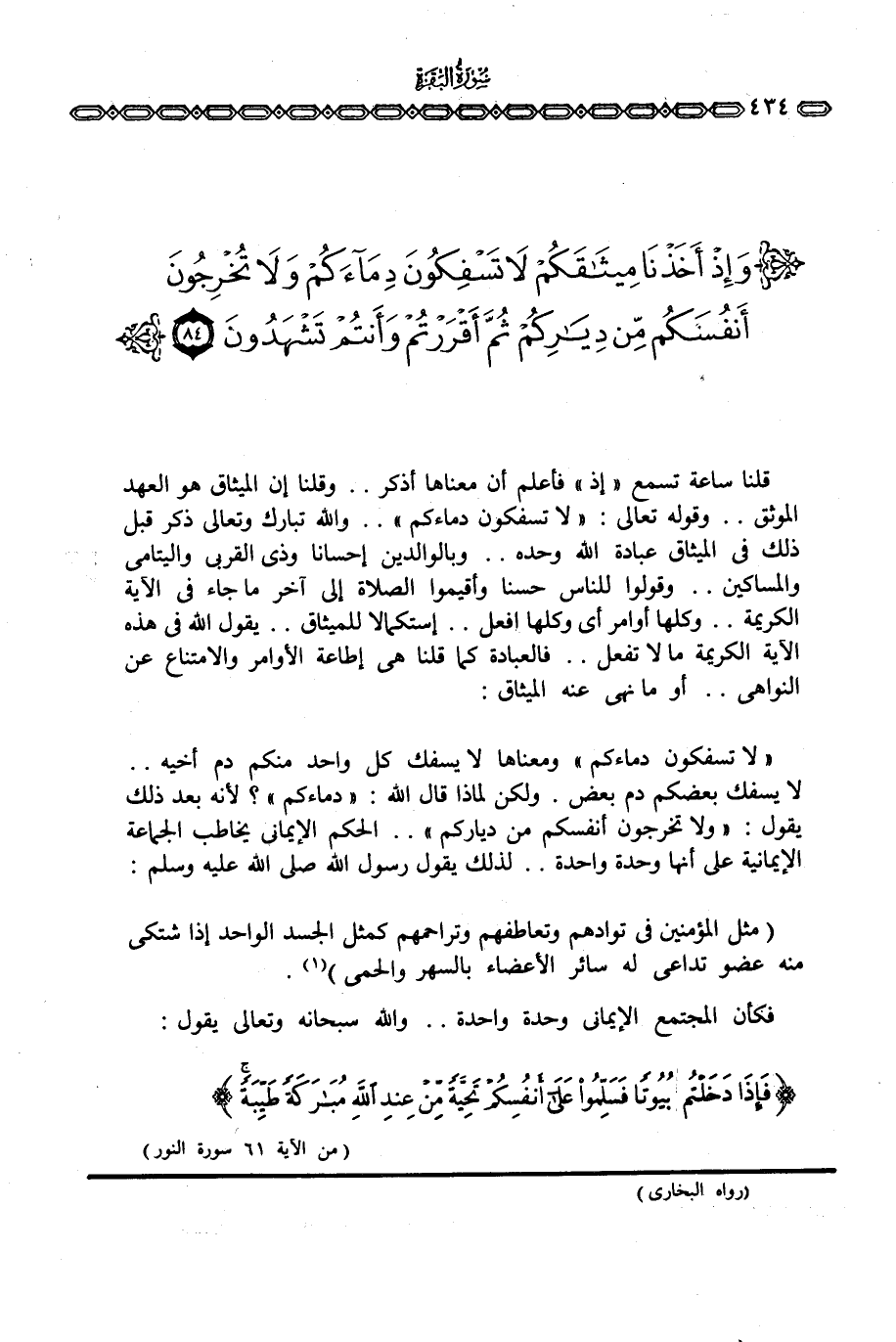 {لاَ تَسْفِكُونَ دِمَآءَكُمْ} ومعناها لا يسفك كل واحد منكم دم أخيه. . لا يسفك بعضكم دم بعض. ولكن لماذا قال الله: «دماءكم» ؟ لأنه بعد ذلك يقول: {وَلاَ تُخْرِجُونَ أَنْفُسَكُمْ مِّن دِيَارِكُمْ} . . الحكم الإيماني يخاطب الجماعة الإيمانية على أنها وحدة واحدة. . لذلك يقول رسول الله صَلَّى اللَّهُ عَلَيْهِ وَسَلَّم َ: