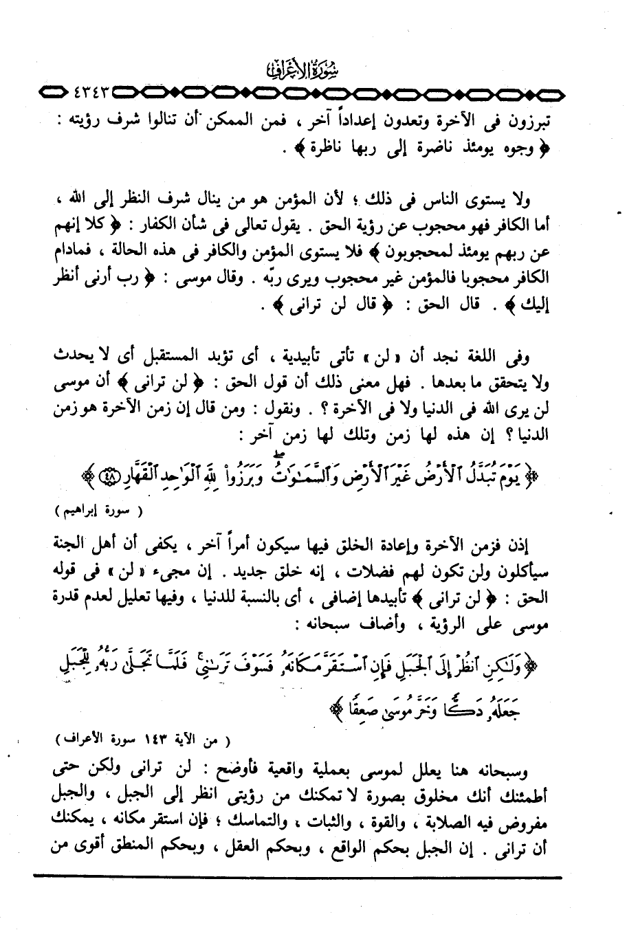 إذن فزمن الآخرة وإعادة الخلق فيها سيكون أمراً آخر، يكفي أن أهل الجنة سيأكلون ولن تكون لهم فضلات، إنه خلق جديد. إن مجيء «لن» في قوله الحق: {لَن تَرَانِي} تأبيدها إضافي، أي بالنسبة للدنيا، وفيها تعليل لعدم قدرة موسى على الرؤية، وأضاف سبحانه: {ولكن انْظُرْ إِلَى الْجَبَلِ فَإِنِ اسْتَقَرَّ مَكَانَهُ فَسَوْفَ تَرَانِي فَلَمَّا تجلى رَبُّهُ لِلْجَبَلِ جَعَلَهُ دَكّاً وَخَرَّ موسى صَعِقاً ... } [الأعراف: 143]