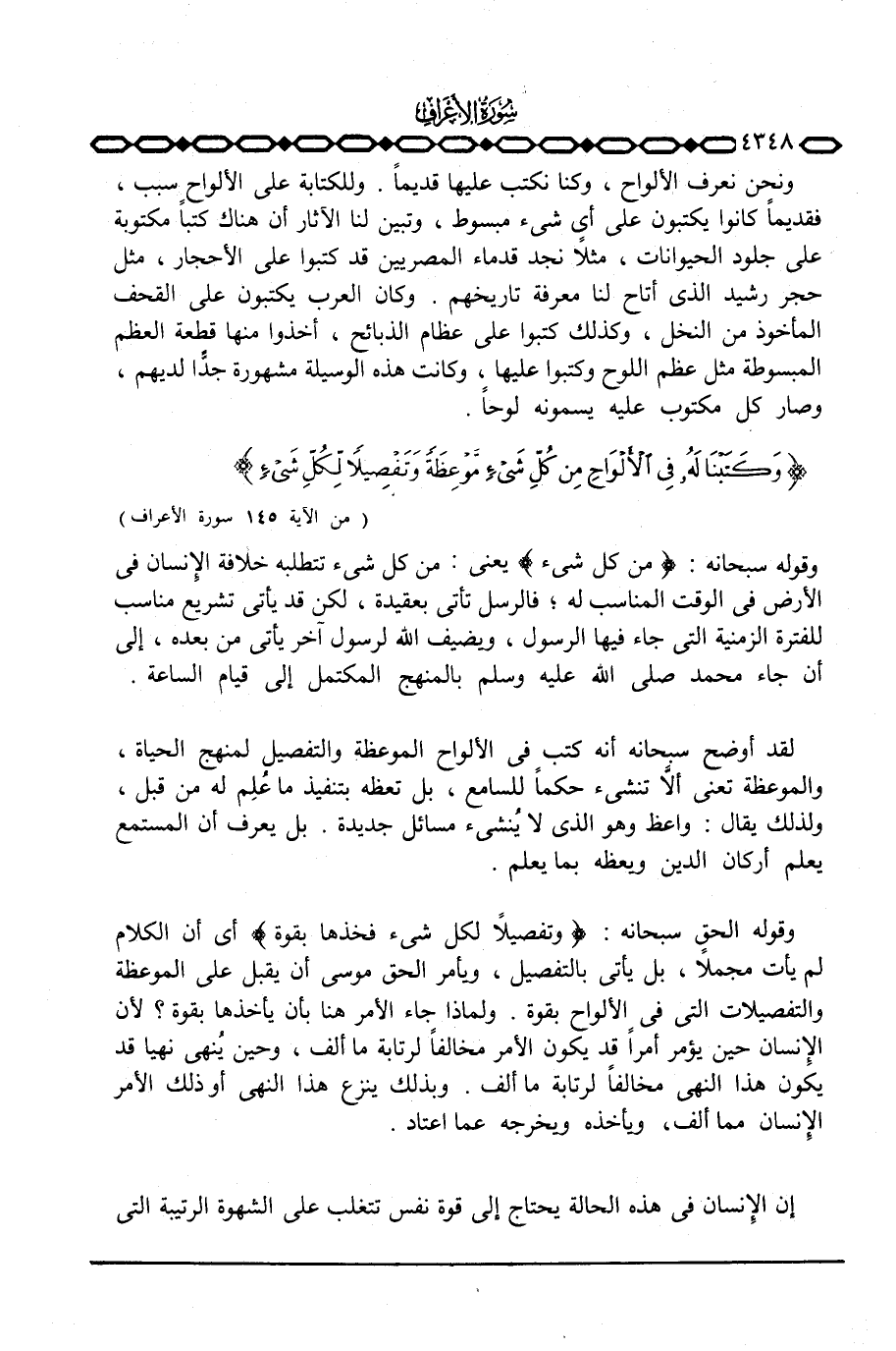 لقد أوضح سبحانه أنه كتب في الألواح الموعظة والتفصيل لمنهج الحياة، والموعظة تعني ألاَّ تنشئ حكماً للسامع، بل تعظه بتنفيذ ما عُلِم له من قبل، ولذلك يقال: واعظ وهو الذي لا يُنشئ مسائل جديدة. بل يعرف أن المستمع يعلم أركان الدين ويعظه بما يعلم.