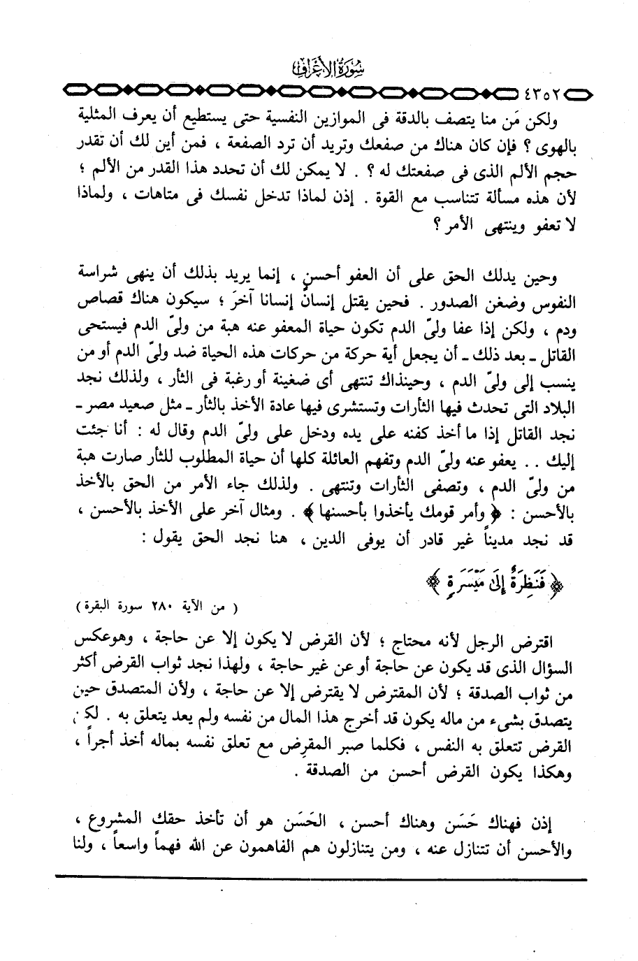 وحين يدلك الحق على أن العفو أحسن، إنما يريد بذلك أن ينهي شراسة النفوس وضغن الصدور. فحين يقتل إنسانٌ إنسانا آخرَ؛ سيكون هناك قصاص ودم، ولكن إذا عفا وليّ الدم تكون حياة المعفو عنه هبة من وليّ الدم فيستحي القاتل - بعد ذلك - أن يجعل أية حركة من حركات هذه الحياة ضد وليّ الدم أو من ينسب إلى وليّ الدم، وحينذاك تنتهي أي ضغينة أو رغبة في الثأر، ولذلك نجد البلاد التي تحدث فيها الثأرات وتستشري فيها عادة الأخذ بالثأر - مثل صعيد مصر - نجد القاتل إذا ما أخذ كفنه على يده ودخل على وليّ الدم وقال له: أنا جئت إليك. . يعفو عنه وليّ الدم وتفهم العائلة كلها أن حياة المطلوب للثأر صارت هبة من وليّ الدم، وتصفى الثأرات وتنتهي. ولذلك جاء الأمر من الحق بالأخذ بالأحسن: {وَأْمُرْ قَوْمَكَ يَأْخُذُواْ بِأَحْسَنِهَا} . ومثال آخر على الأخذ بالأحسن، قد نجد مديناً غير قادر أن يوفي الدين، هنا نجد الحق يقول: {فَنَظِرَةٌ إلى مَيْسَرَةٍ ... } [البقرة: 280]