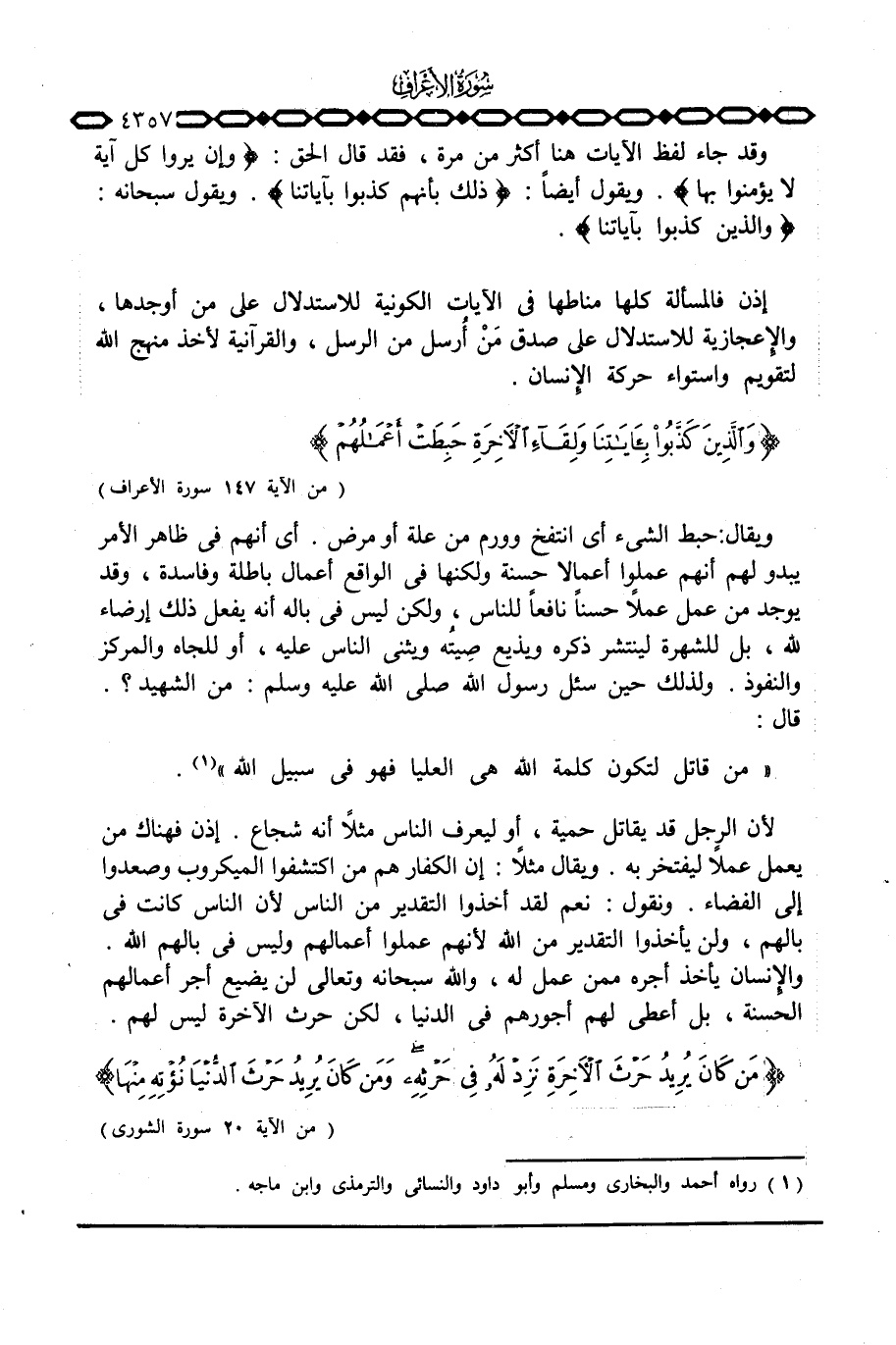 لأن الرجل قد يقاتل حمية، أو ليعرف الناس مثلاً أنه شجاع. إذن فهناك من يعمل عملاً ليفتخر به. ويقال مثلاً: إن الكفار هم من اكتشفوا الميكروب وصعدوا إلى الفضاء. ونقول: نعم لقد أخذوا التقدير من الناس لأن الناس كانت في بالهم، ولن يأخذوا التقدير من الله لأنهم عملوا أعمالهم وليس في بالهم الله. والإِنسان يأخذ أجره ممن عمل له، والله سبحانه وتعالى لن يضيع أجر أعمالهم الحسنة، بل أعطى لهم أجورهم في الدنيا، لكن حرث الآخرة ليس لهم. {مَن كَانَ يُرِيدُ حَرْثَ الآخرة نَزِدْ لَهُ فِي حَرْثِهِ وَمَن كَانَ يُرِيدُ حَرْثَ الدنيا نُؤْتِهِ مِنْهَا ... } [الشورى: 20]