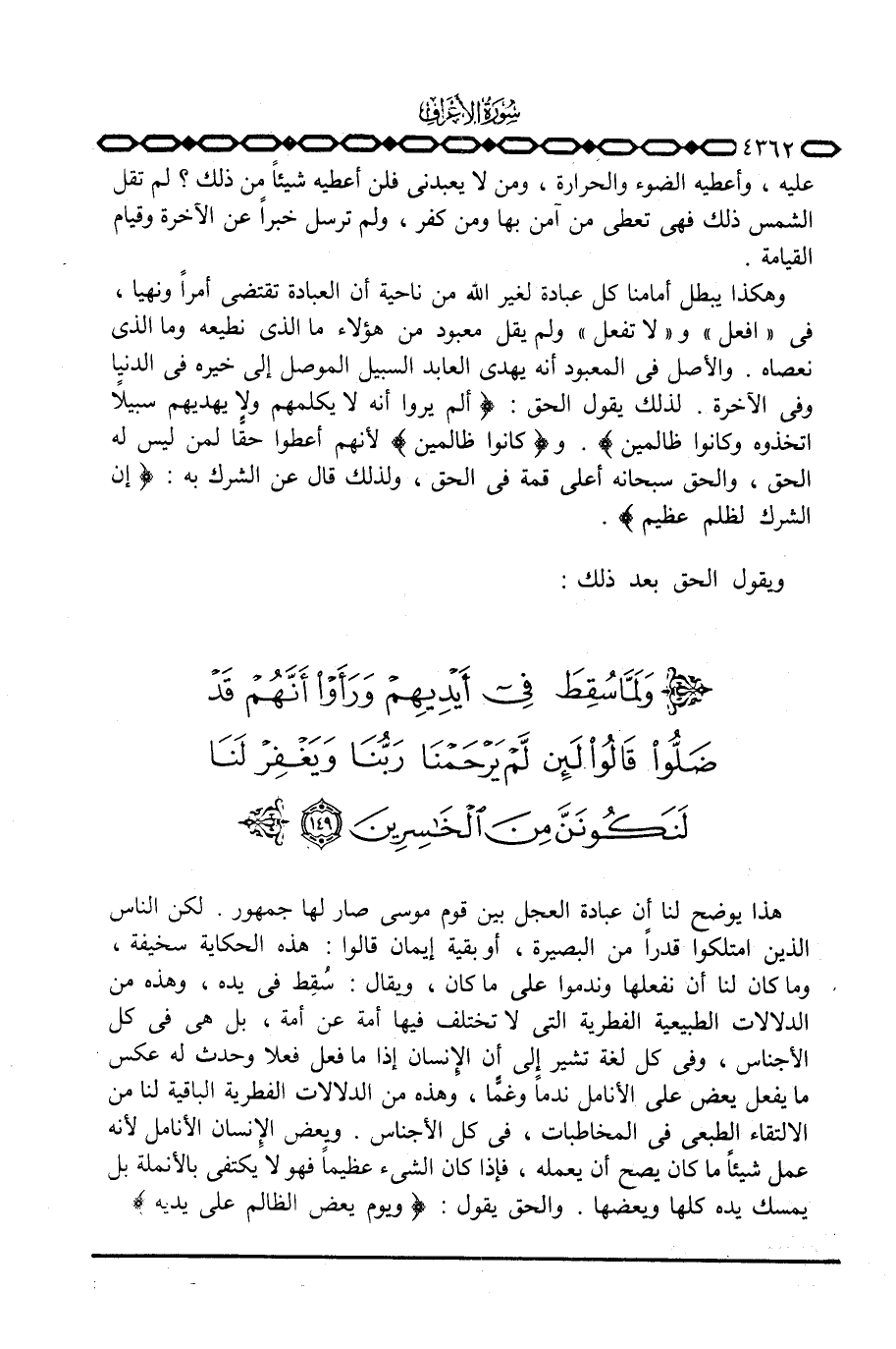 هذا يوضح لنا أن عبادة العجل بين قوم موسى صار لها جمهور. لكن الناس الذين امتلكوا قدراً من البصيرة، أو بقية إيمان قالوا: هذه الحكاية سخيفة، وما كان لنا أن نفعلها وندموا على ما كان، ويقال: سُقِط في يده، وهذه من الدلالات الطبيعية الفطرية التي لا تختلف فيها أمة عن أمة، بل هي في كل الأجناس، وفي كل لغة تشير إلى أن الإِنسان إذا ما فعل فعلا وحدث له عكس ما يفعل يعض على الأنامل ندماً وغمًّا، وهذه من الدلالات الفطرية الباقية لنا من الالتقاء الطبعي في المخاطبات، في كل الأجناس. ويعض الإِنسان الأنامل لأنه عمل شيئاً ما كان يصح أن يعمله، فإذا كان الشيء عظيماً فهو لا يكتفي بالأنملة بل يمسك يده كلها ويعضها. والحق يقول: {وَيَوْمَ يَعَضُّ الظالم على يَدَيْهِ} .