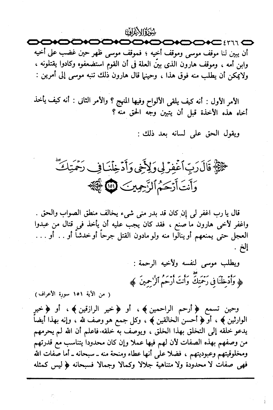 قال يا رب اغفر لي إن كان قد بدر مني شيء يخالف منطق الصواب والحق. واغفر لأخي هارون ما صنع، فقد كان يجب عليه أن يأخذ في قتال من عبدوا العجل حتى يمنعهم أو ينالوا منه ولو مادون القتل جرحاً أو خدشاً أو. . أو. . إلخ.