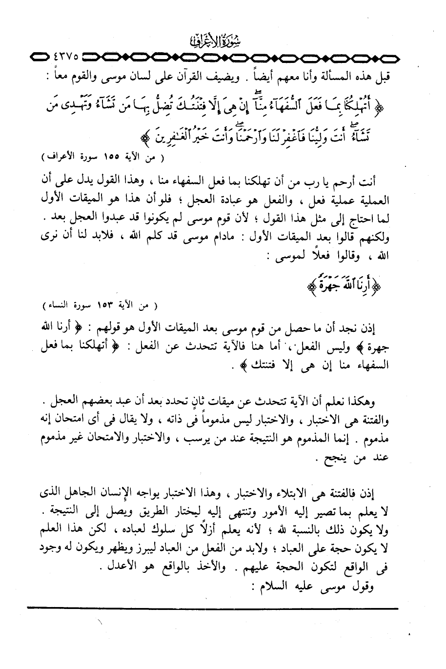 قبل هذه المسألة وأنا معهم أيضاً. ويضيف القرآن على لسان موسى والقوم معاً: { ... أَتُهْلِكُنَا بِمَا فَعَلَ السفهآء مِنَّآ إِنْ هِيَ إِلاَّ فِتْنَتُكَ تُضِلُّ بِهَا مَن تَشَآءُ وَتَهْدِي مَن تَشَآءُ أَنتَ وَلِيُّنَا فاغفر لَنَا وارحمنا وَأَنتَ خَيْرُ الغافرين} {الأعراف: 155]