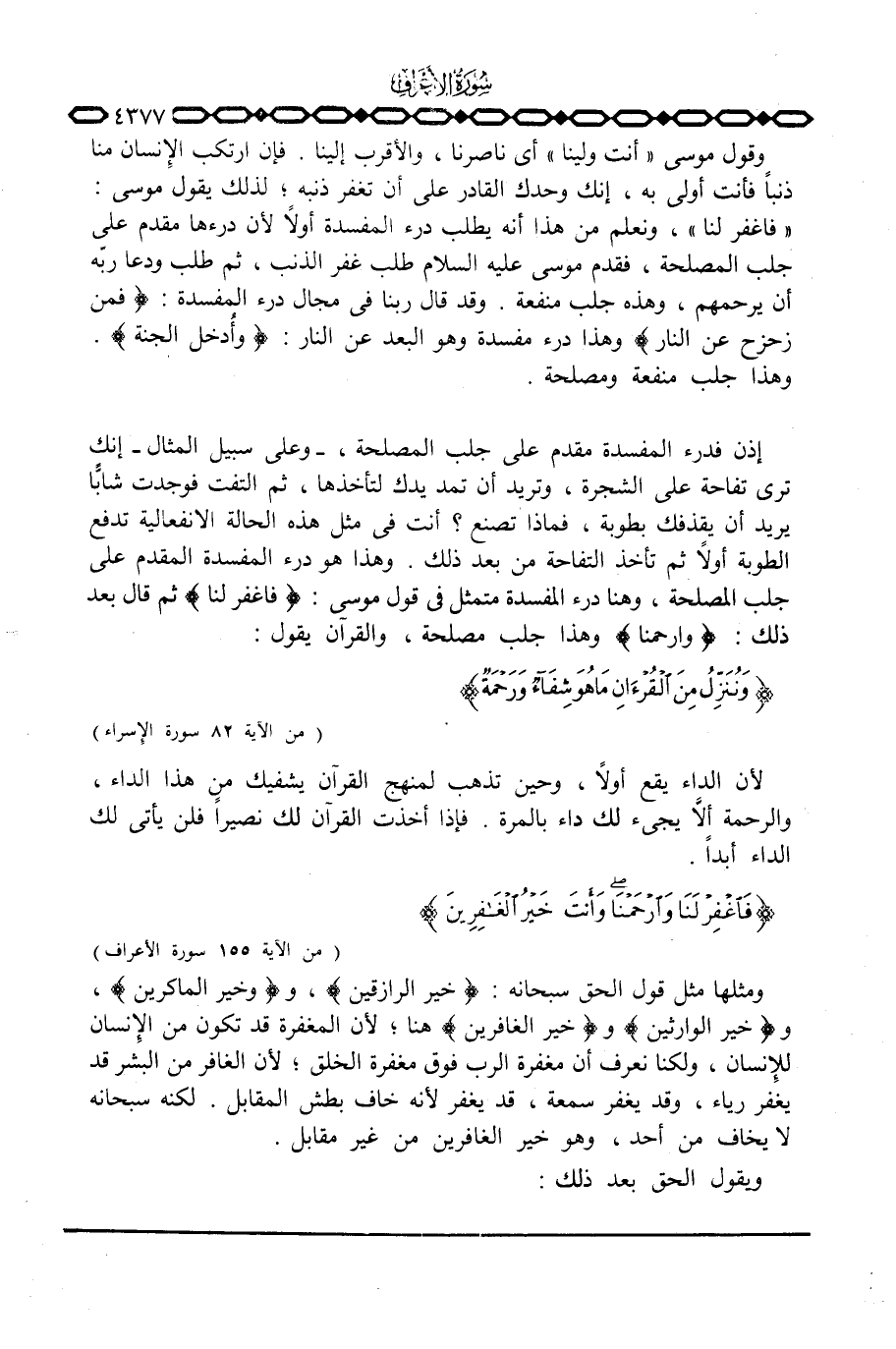 إذن فدرء المفسدة مقدم على جلب المصلحة، - وعلى سبيل المثال - إنك ترى تفاحة على الشجرة، وتريد أن تمد يدك لتأخذها، ثم التفت فوجدت شابًّا يريد أن يقذفك بطوبة، فماذا تصنع؟ انت في مثل هذه الحالة الانفعالية تدفع الطوبة أولاً ثم تأخذ التفاحة من بعد ذلك. وهذا هو درء المفسدة المقدم على جلب المصلحة، وهنا درء المفسدة متمثل في قول موسى: {فاغفر لَنَا} ثم قال بعد ذلك: {وارحمنا} وهذا جلب مصلحة، والقرآن يقول: {وَنُنَزِّلُ مِنَ القرآن مَا هُوَ شِفَآءٌ وَرَحْمَةٌ ... } [الإِسراء: 82]