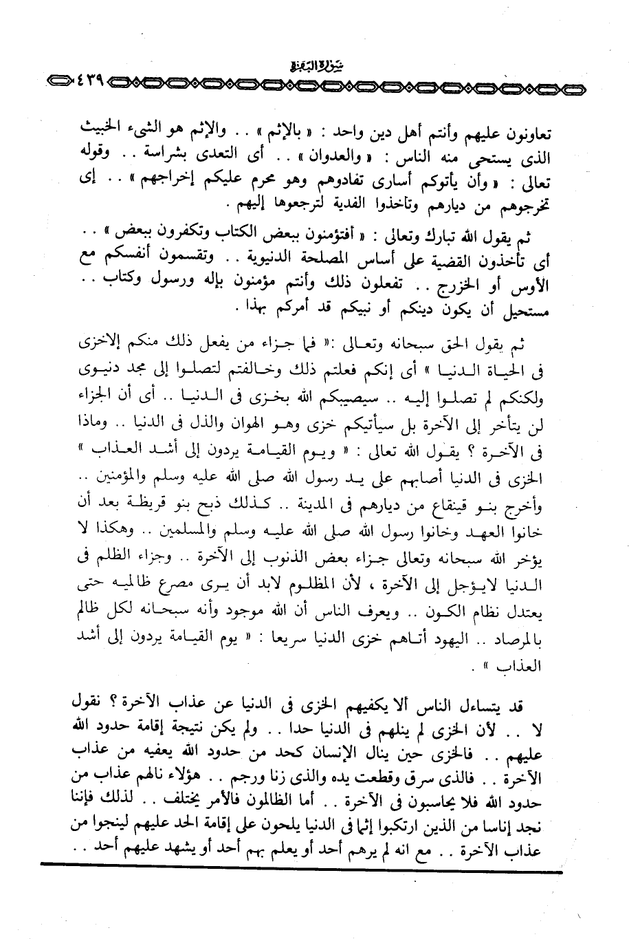 تعاونون عليهم وأنتم أهل دين واحد: «بالإثم» . . والإثم هو الشيء الخبيث الذي يستحي منه الناس: «والعدوان» . . أي التعدي بشراسة. . وقوله تعالى: {أَفَتُؤْمِنُونَ بِبَعْضِ الكتاب وَتَكْفُرُونَ بِبَعْضٍ} . . أي تأخذون القضية على أساس المصلحة الدنيوية. . وتقسمون أنفسكم مع الأوس أو الخزرج. . تفعلون ذلك وأنتم مؤمنون بإله ورسول وكتاب. . مستحيل أن يكون دينكم أو نبيكم قد أمركم بهذا.