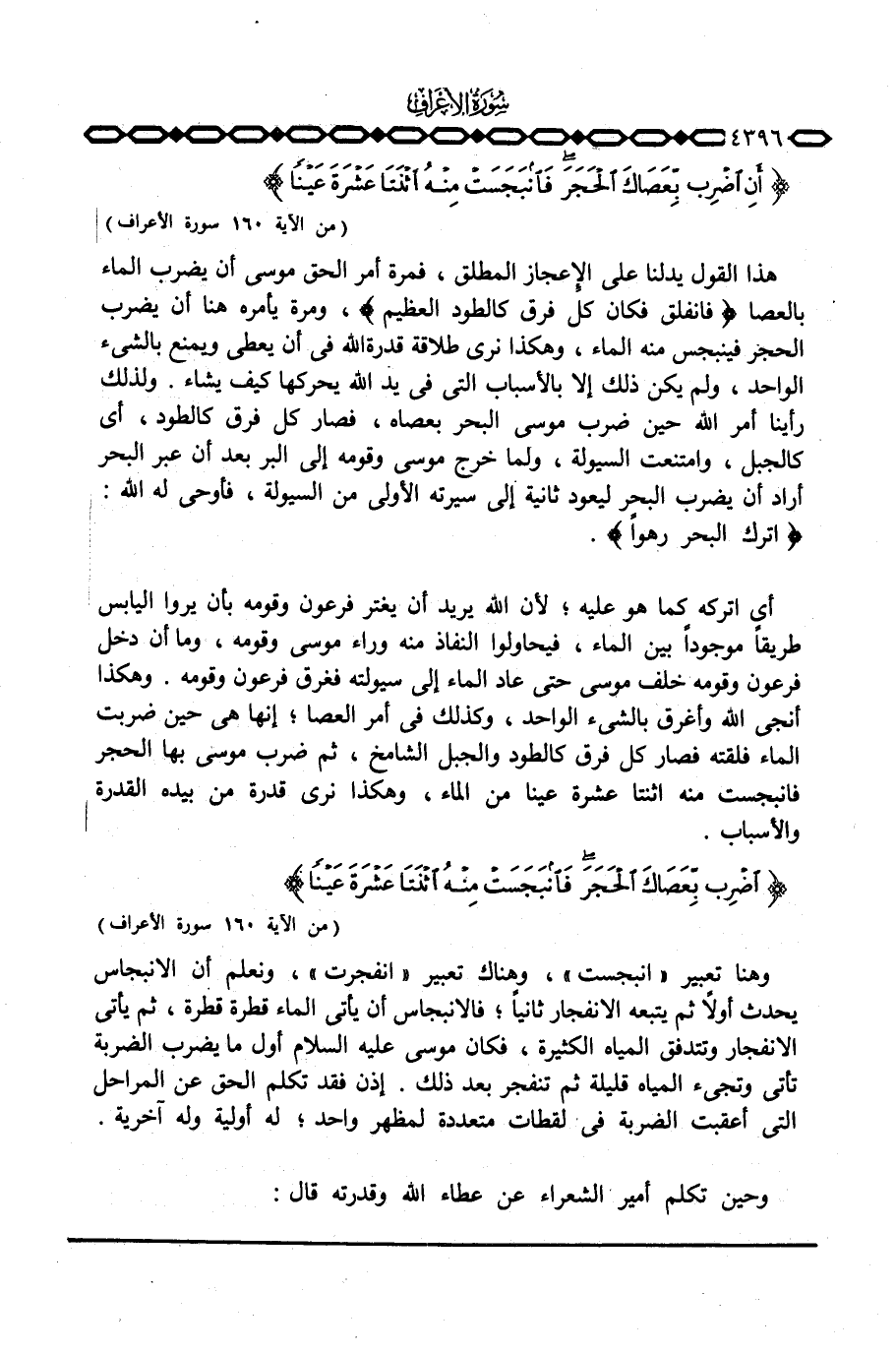 وهنا تعبير «انبجست» ، وهناك تعبير «انفجرت» ، ونعلم أن الانبجاس يحدث أولاً ثم يتبعه الانفجار ثانياً، فالانبجاس أن يأتي الماء قطرة قطرة، ثم يأتي الانفجار وتتدفق المياه الكثيرة، فكان موسى عليه السلام أول ما يضرب الضربة تأتي وتجيء المياه قليلة ثم تنفجر بعد ذلك. إذن فقد تكلم الحق عن المراحل التي أعقبت الضربة في لقطات متعددة لمظهر واحد؛ له أولية وله آخرية.