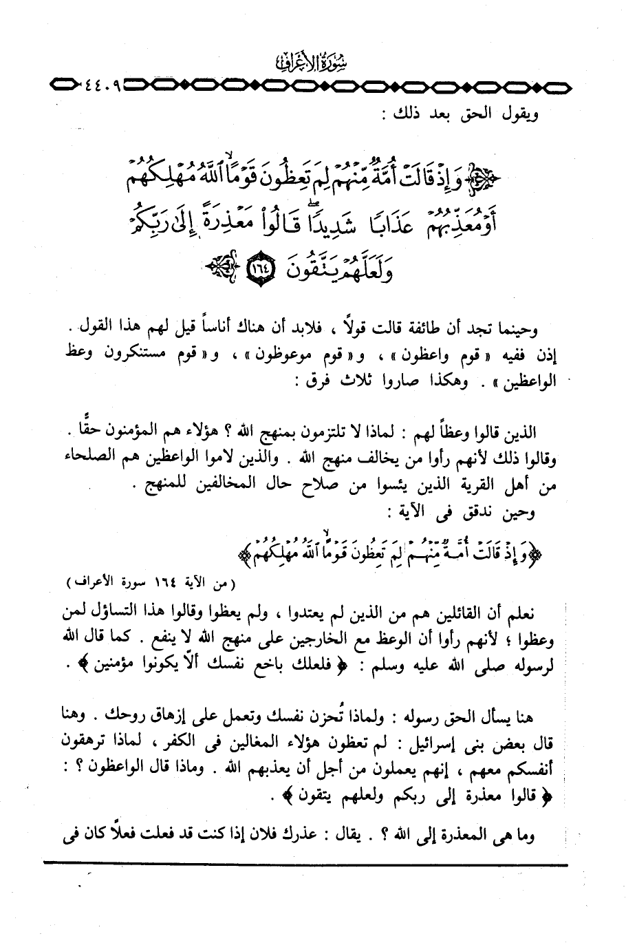 هنا يسأل الحق رسوله: ولماذا تُحزن نفسك وتعمل على إزهاق روحك. وهنا قال بعض بني إسرائيل: لم تعظون هؤلاء المغالين في الكفر، لماذا ترهقون أنفسكم معهم، إنهم يعملون من أجل أن يعذبهم الله. وماذا قال الواعظون؟ : {قَالُواْ مَعْذِرَةً إلى رَبِّكُمْ وَلَعَلَّهُمْ يَتَّقُونَ} .