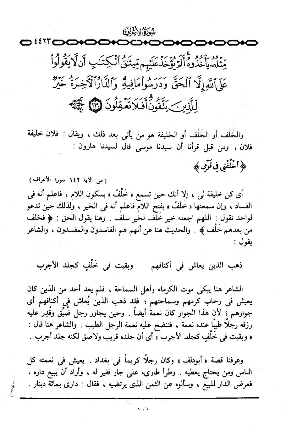 الشاعر هنا يبكي موت الكرماء وأهل السماحة، فلم يعد أحد من الذين كان يعيش في رحاب كرمهم وسماحتهم؛ فقد ذهب الذين يُعاش في أكنافهم أي جوارهم؛ لأن هذا الجوار كان نعمة أيضاً. وحين يجاور رجل ضُيِّق وقُدِر عليه رزقه رجلاً طيباً عنده نعمة، فتنضح عليه نعمة الرجل الطيب. والشاعر هنا قال: «وبقيت في خَلْفٍ كجلد الأجرب» أي أن جلده قريب ولاصق لكنه جلد أجرب.