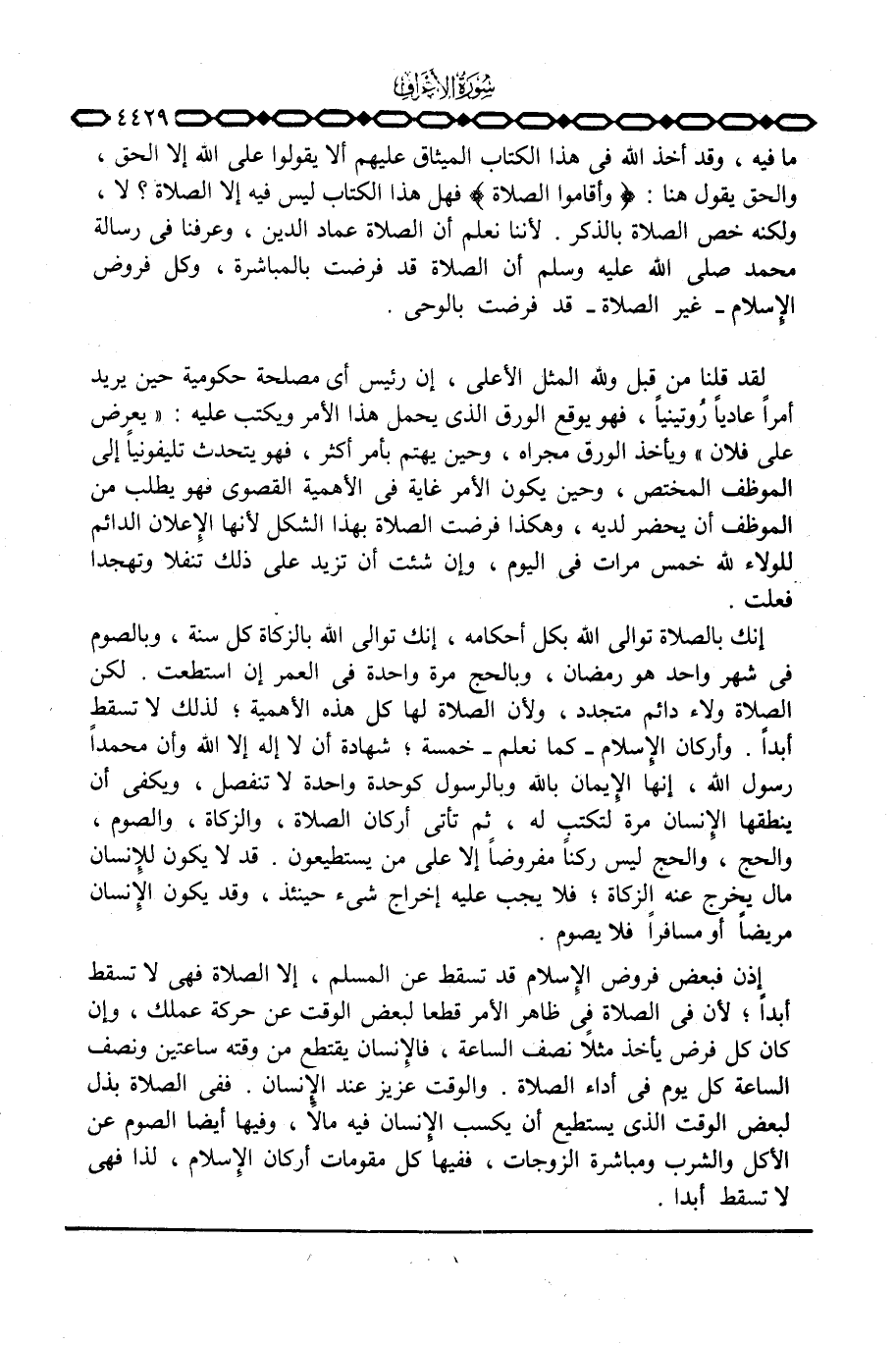 إذن فبعض فروض الإِسلام قد تسقط عن المسلم، إلا الصلاة فهي لا تسقط أبداً؛ لأن في الصلاة في ظاهر الأمر قطعا لبعض الوقت عن حركة عملك، وإن كان كل فرض يأخذ مثلاً نصف ساعة، فالإِنسان يقتطع من وقته ساعتين ونصف الساعة كل يوم في أداء الصلاة. والوقت عزيز عند الإِنسان. ففي الصلاة بذل لبعض الوقت الذي يستطيع أن يكسب الإِنسان فيه مالاً، وفيها أيضا الصوم عن الأكل والشرب ومباشرة الزوجات، ففيها كل مقومات أركان الإِسلام، لذا فهي لا تسقط أبدا.