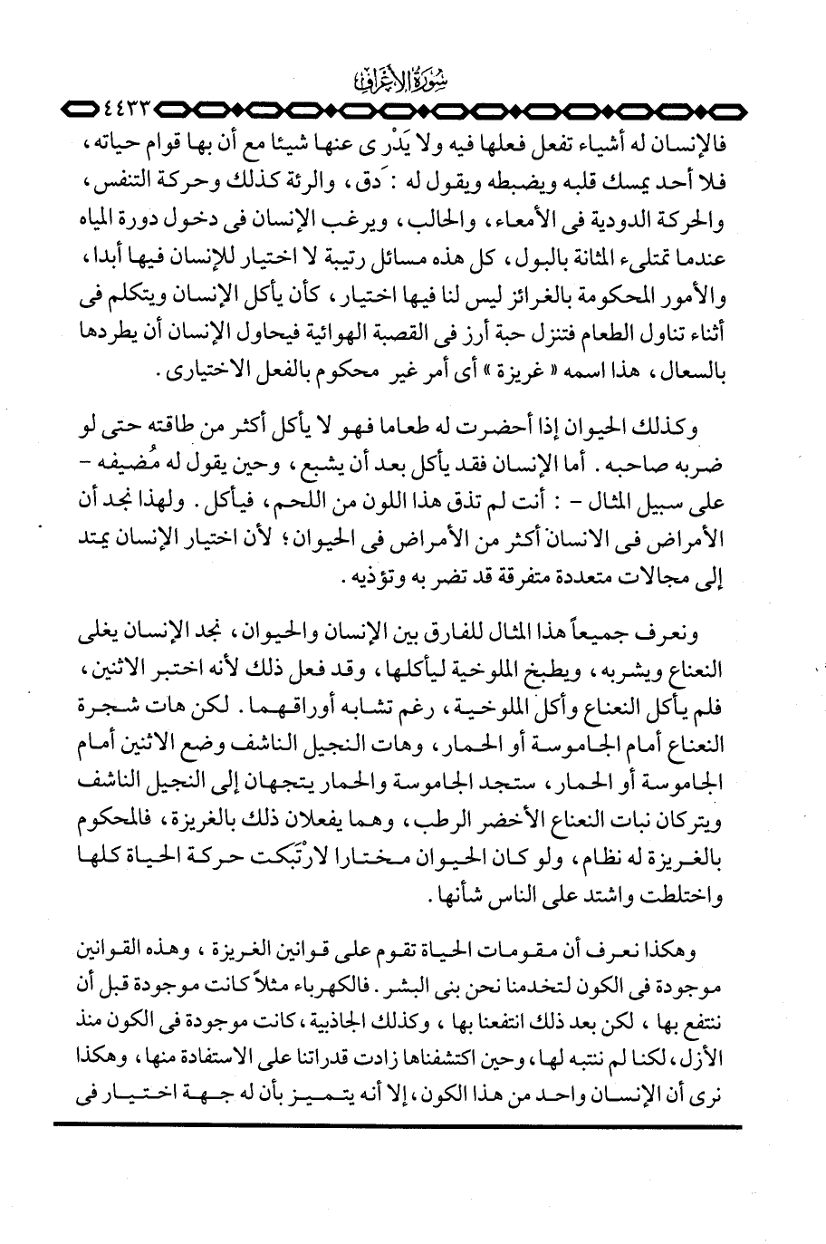 وكذلك الحيوان إذا أحضرت له طعاما فهو لا يأكل أكثر من طاقته حتى لو ضربه صاحبه. أما الإنسان فقد يأكل بعد أن يشبع، وحين يقول له مُضيفه - على سبيل المثال -: أنت لم تذق هذا اللون من اللحم، فيأكل. ولهذا نجد أن الأمراض في الانسان أكثر من الأمراض في الحيوان؛ لأن اختيار الإنسان يمتد إلى مجالات متعددة متفرقة قد تضر به وتؤذيه.