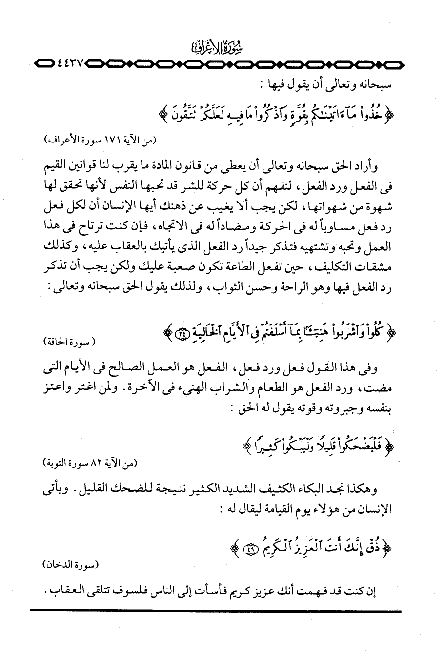 وفي هذا القول فعل ورد فعل، الفعل هو العمل الصالح في الأيام التي مضت، ورد الفعل هو الطعام والشراب الهنيء في الآخرة. ولمن اغتر واعتز بنفسه وجبروته وقوته يقول له الحق: {فَلْيَضْحَكُواْ قَلِيلاً وَلْيَبْكُواْ كَثِيراً ... } [التوبة: 82]