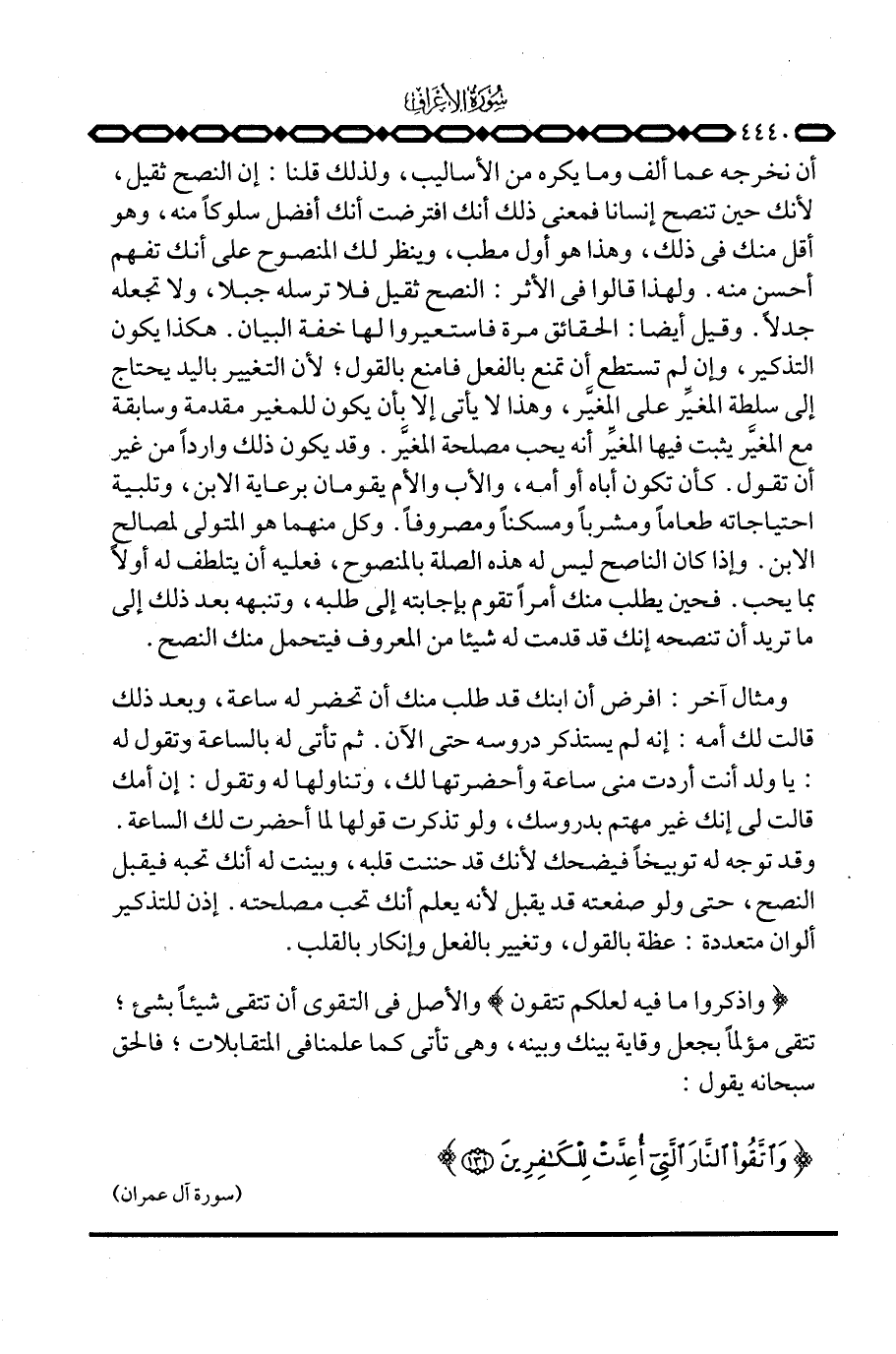 أن نخرجه عما ألف وما يكره من الأساليب، ولذلك قلنا: إن النصح ثقيل، لأنك حين تنصح إنسانا فمعنى ذلك أنك افترضت أنك أفضل سلوكاً منه، وهو أقل منك في ذلك، وهذا هو أول مطب، وينظر لك المنصوح على أنك تفهم أحسن منه. ولهذا قالوا في الأثر: النصح ثقيل فلا ترسله جبلا، ولا تجعله جدلاً. وقيل أيضا: الحقائق مرة فاستعيروا لها خفة البيان. هكذا يكون التذكير، وإن لم تستطع أن تمنع بالفعل فامنع بالقول؛ لأن التغيير باليد يحتاج إلى سلطة المغيِّر على المغيَّر، وهذا لا يأتي إلا بأن يكون للمغير مقدمة وسابقة مع المغيَّر يثبت فيها المغيِّر أنه يحب مصلحة المغيَّر. وقد يكون ذلك وارداً من غير أن تقول. كأن تكون أباه أو أمه، والأب والأم يقومان برعاية الابن، وتلبية احتياجاته طعاماً ومشرباً ومسكناً ومصروفاً. وكل منهما هو المتولي لمصالح الابن. وإذا كان الناصح ليس له هذه الصلة بالمنصوح، فعليه أن يتلطف له أولاً بما يحب. فحين يطلب منك أمراً تقوم بإجابته إلى طلبه، وتنبهه بعد ذلك إلى ما تريد أن تنصحه إنك قد قدمت له شيئاً من المعروف فيتحمل منك النصح.
