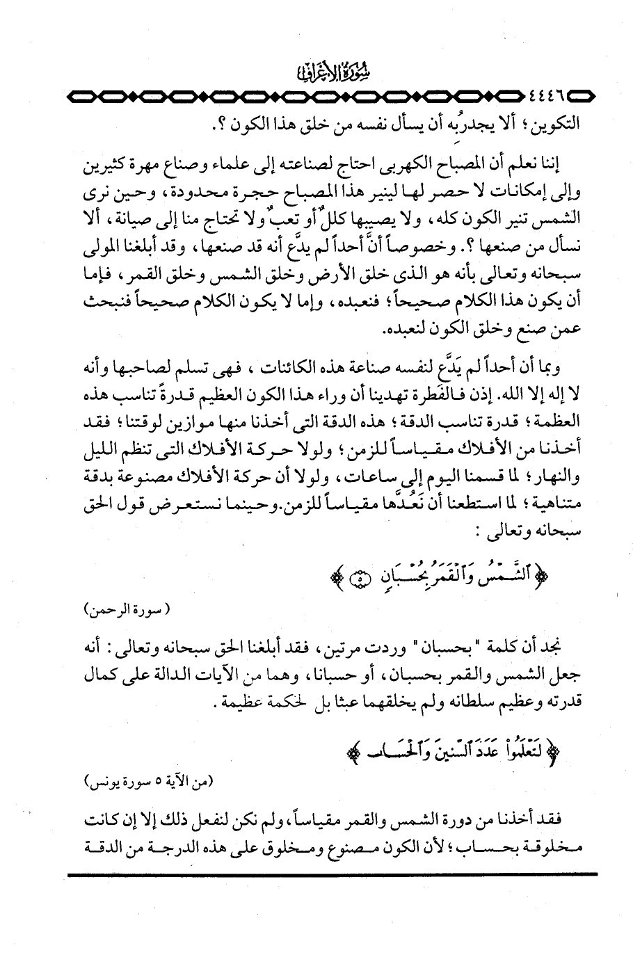 فقد أخذنا من دورة الشمس والقمر مقياساً، ولم نكن لنفعل ذلك إلا أن كانت مخلوقة بحساب؛ لأن الكون مصنوع ومخلوق على هذه الدرجة من الدقة