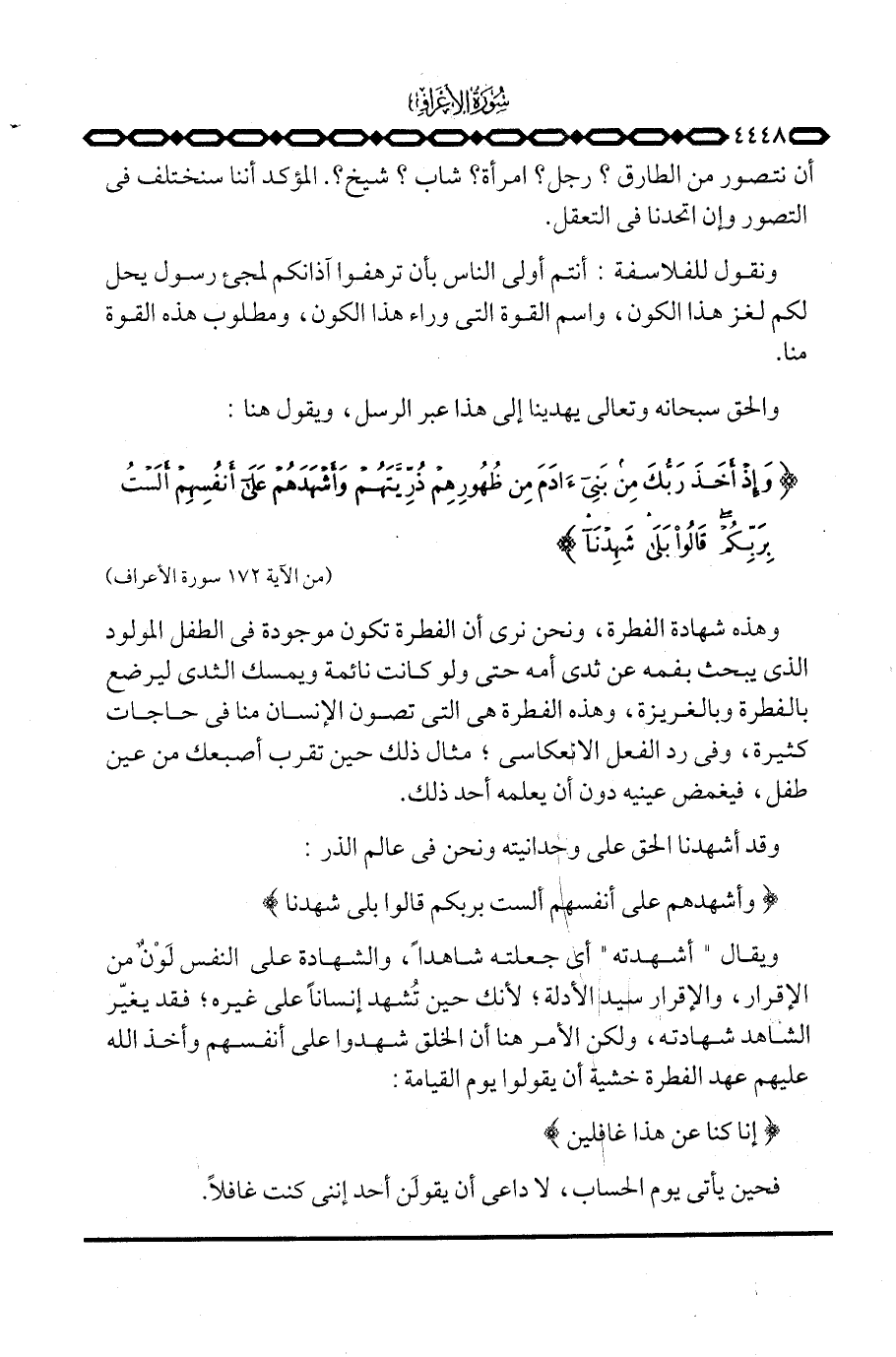 ويقال «أشهدته» أي جعلته شاهداً، والشهادة على النفس لَوْنٌ من الإقرار، والإقرار سيد الأدلة؛ لأنك حين تُشهد إنساناً على غيره؛ فقد يغيّر الشاهد شهادته، ولكن الأمر هنا أن الخلق شهدوا على أنفسهم وأخذ الله عليهم عهد الفطرة خشية أن يقولوا يوم القيامة: {إِنَّا كُنَّا عَنْ هذا غَافِلِينَ}