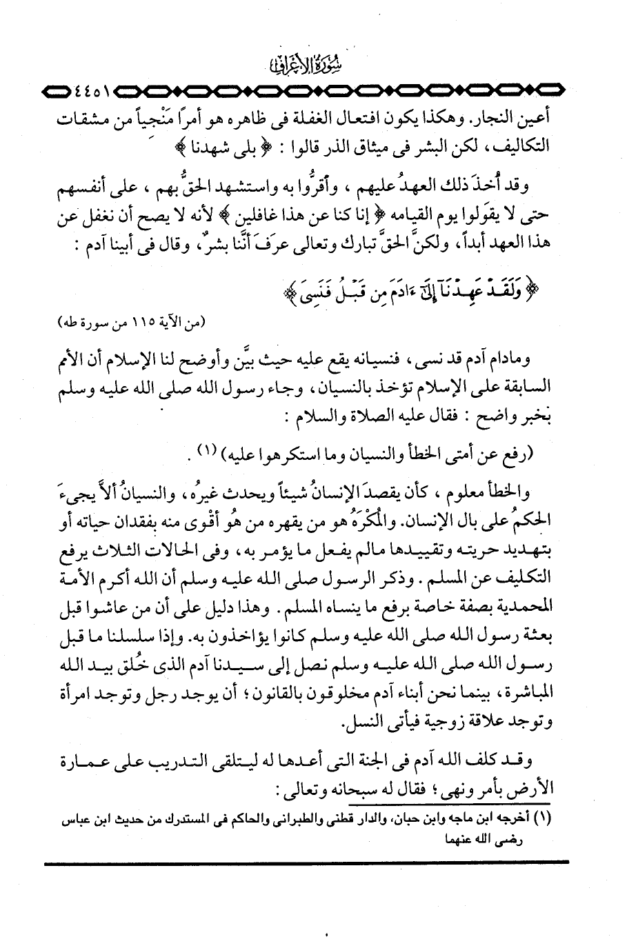 والخطأ معلوم، كأن يقصدَ الإنسانُ شيئاً ويحدث غيرهُ، والنسيانُ ألاَّ يجيءَ الحكمُ على بال الإنسان. والمُكْرَهُ هو من يقهره من هُو أقْوى منه بفقدان حياته أو بتهديد حريته وتقييدها ما لم يفعل ما يؤمر به، وفي الحالات الثلاث يرفع التكليف عن المسلم. وذكر الرسول صَلَّى اللَّهُ عَلَيْهِ وَسَلَّم َ أن الله أكرم الأمة المحمدية بصفة خاصة برفع ما ينساه المسلم. وهذا دليل على أن من عاشوا قبل بعثة رسول الله صَلَّى اللَّهُ عَلَيْهِ وَسَلَّم َ كانوا يؤاخذون به. وإذا سلسلنا من قبل رسول الله صَلَّى اللَّهُ عَلَيْهِ وَسَلَّم َ نصل إلى سيدنا آدم الذي خُلق بيد الله المباشرة، بينما نحن أبناء آدم مخلوقون بالقانون؛ أن يوجد رجل وتوجد امرأة وتوجد علاقة زوجية فيأتي النسل.