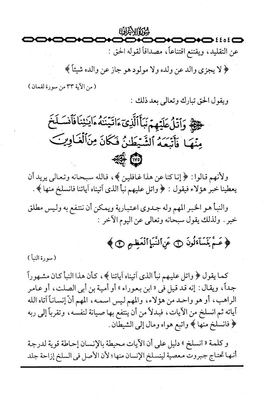 كما يقول {واتل عَلَيْهِمْ نَبَأَ الذيءَاتَيْنَاهُءَايَاتِنَا} ، كأن هذا النبأ كان مشهوراً جداً، ويقال: إنه قد قيل في «ابن بعوراء» أو أمية بن أبي الصلت، أو عامر الراهب، أو هو واحد من هؤلاء، والمهم ليس اسمه، المهم أنّ إنساناً آتاه الله آياته ثم انسلخ من الآيات، فبدلاً من أن ينتفع بها صيانة لنفسه، وتقرباً إلى ربه {فانسلخ مِنْهَا} واتبع هواه ومال إلى الشيطان.