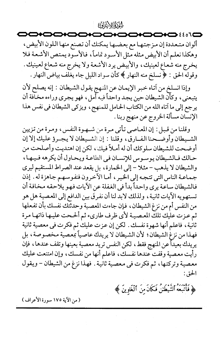 وقلنا من قبل: إن المعاصي تأتي مرة من شهوة النفس، ومرة من تزيين الشيطان وأوضحنا الفارق، وقلنا: إن الشيطان لا يجرؤ عليك إلا إن أوضحت للشيطان سلوكك أن له أملاً فيك، لكن إن اهتديت وأصلحت من حالك فالشيطان يوسوس للإنسان في الطاعة ويحاول أن يكرهه فيها، والشيطان لا يذهب - مثلا - إلى الخمارة، بل يقعد عند الصراط المستقيم ليرى جماعة الناس التي تتجه إلى الخير، أما الاخرون فنفوسهم جاهزة له. إذن فالشيطان ساعة يرى واحداً بدأ في الغفلة عن الآيات فهو يلاحقه مخافة أن تستهويه الآيات ثانية، ولذلك لابد لنا أن نفرق بين الدافع إلى المعصية هل هو من النفس أم من نزغ الشيطان، فإن جاءت المعصية وحدثتك نفسك بأن تفعلها ثم عزت عليك تلك المعصية لأي ظرف طارئ ثم ألححت عليها ذاتها مرة ثانية، فاعلم أنها شهوة نفسك. لكن إن عزت عليك ثم فكرت في معصية ثانية فهذا من نزغ الشيطان؛ لأن الشيطان لا يريدك عاصياً بمعصية مخصوصة، بل يريدك بعيداً عن المنهج فقط، لكن النفس تريد معصية بعينها وتقف عندها، فإن رأيت معصية وقفت عندها نفسك، فاعلم أنها من نفسك، وإن امتنعت عليك معصية وتركتها، ثم فكرت في معصية ثانية. فهذا نزغ من الشيطان - ويقول الحق: { ... فَأَتْبَعَهُ الشيطان فَكَانَ مِنَ الغاوين} [الأعراف: 175]