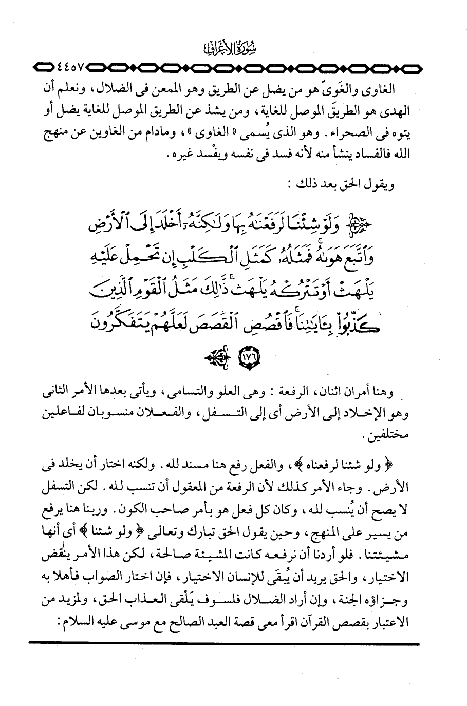 {وَلَوْ شِئْنَا لَرَفَعْنَاهُ} ، والفعل رفع هنا مسند لله. ولكنه اختار أن يخلد في الأرض. وجاء الأمر كذلك لأن الرفعة من المعقول أن تنسب لله. لكن التسفل لا يصح أن يُنسب لله، وكان كل فعل هو بأمر صاحب الكون. وربنا هنا يرفع من يسير على المنهج، وحين يقول الحق تبارك وتعالى {وَلَوْ شِئْنَا} أي أنها مشيئتنا. فلو أردنا أن نرفعه كانت المشيئة صالحة، لكن هذا الأمر ينقض الاختيار، والحق يريد أن يُبقَي للإنسان الاختيار، فإن اختار الصواب فأهلا به وجزاؤه الجنة، وإن أراد الضلال فلسوف يَلْقى العذاب الحق، ولمزيد من الاعتبار بقصص القرآن اقرأ معي قصة العبد الصالح مع موسى عليه السلام: